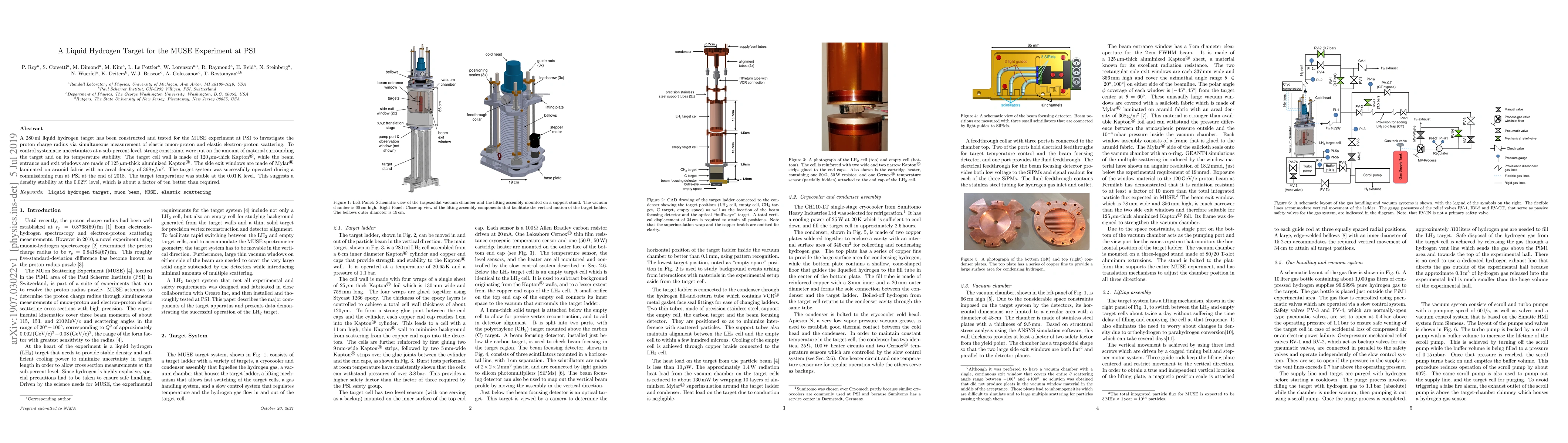 A 280 ml liquid hydrogen target has been constructed and tested for the MUSE experiment at PSI to investigate the proton charge radius via simultaneous measurement of elastic muon-proton and elastic electron-proton scattering. To control systematic uncertainties at a sub-percent level, strong constraints were put on the amount of material surrounding the target and on its temperature stability. The target cell wall is made of $120\,\mu$m-thick Kapton, while the beam entrance and exit windows are made of $125\,\mu$m-thick aluminized Kapton. The side exit windows are made of Mylar laminated on aramid fabric with an areal density of $368\,$g/m$^2$. The target system was successfully operated during a commissioning run at PSI at the end of 2018. The target temperature was stable at the 0.01 K level. This suggests a density stability at the $0.02\,$% level, which is about a factor of ten better than required.