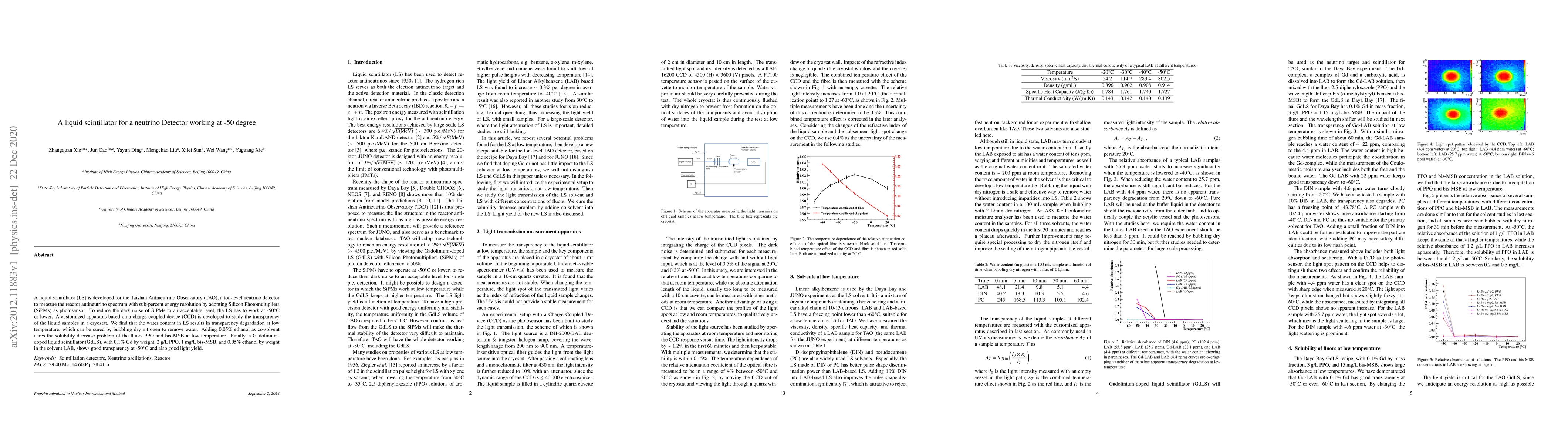 This paper develops a liquid scintillator for a neutrino detector at Taishan Antineutrino Observatory, requiring operation at -50°C to reduce SiPM dark noise. The study finds that water content degrades transparency at low temperatures, which is resolved by drying and adding ethanol, resulting in a GdLS formulation that maintains good transparency and light yield at -50°C.