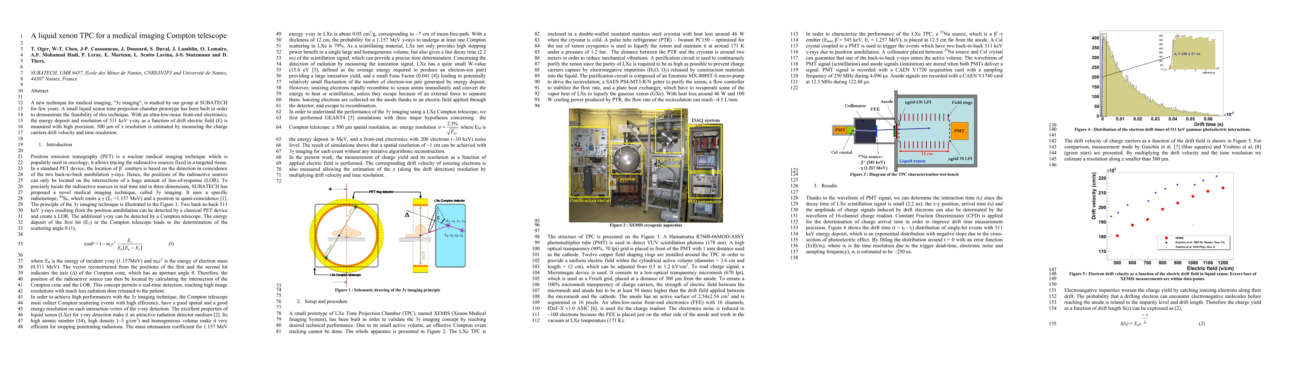 A new technique for medical imaging, "3{\gamma} imaging", is studied by our group at SUBATECH for few years. A small liquid xenon time projection chamber prototype has been built in order to demonstrate the feasibility of this technique. With an ultra-low-noise front-end electronics, the energy deposit and resolution of 511 keV {\gamma}-ray as a function of drift electric field (E) is measured with high precision. 500 {\mu}m of z resolution is estimated by measuring the charge carriers drift velocity and time resolution.
