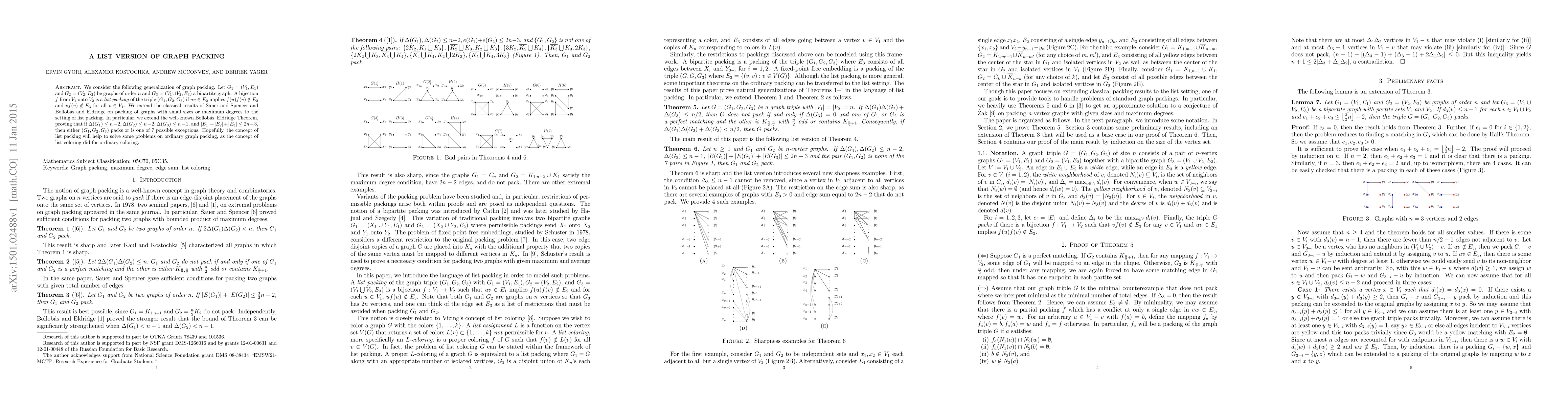 We consider the following generalization of graph packing. Let $G_{1} = (V_{1}, E_{1})$ and $G_{2} = (V_{2}, E_{2})$ be graphs of order $n$ and $G_{3} = (V_{1} \cup V_{2}, E_{3})$ a bipartite graph. A bijection $f$ from $V_{1}$ onto $V_{2}$ is a list packing of the triple $(G_{1}, G_{2}, G_{3})$ if $uv \in E_{2}$ implies $f(u)f(v) \notin E_{2}$ and $vf(v) \notin E_{3}$ for all $v \in V_{1}$. We extend the classical results of Sauer and Spencer and Bollob\'{a}s and Eldridge on packing of graphs with small sizes or maximum degrees to the setting of list packing. In particular, we extend the well-known Bollob\'{a}s--Eldridge Theorem, proving that if $\Delta (G_{1}) \leq n-2, \Delta(G_{2}) \leq n-2, \Delta(G_{3}) \leq n-1$, and $|E_1| + |E_2| + |E_3| \leq 2n-3$, then either $(G_{1}, G_{2}, G_{3})$ packs or is one of 7 possible exceptions. Hopefully, the concept of list packing will help to solve some problems on ordinary graph packing, as the concept of list coloring did for ordinary coloring.