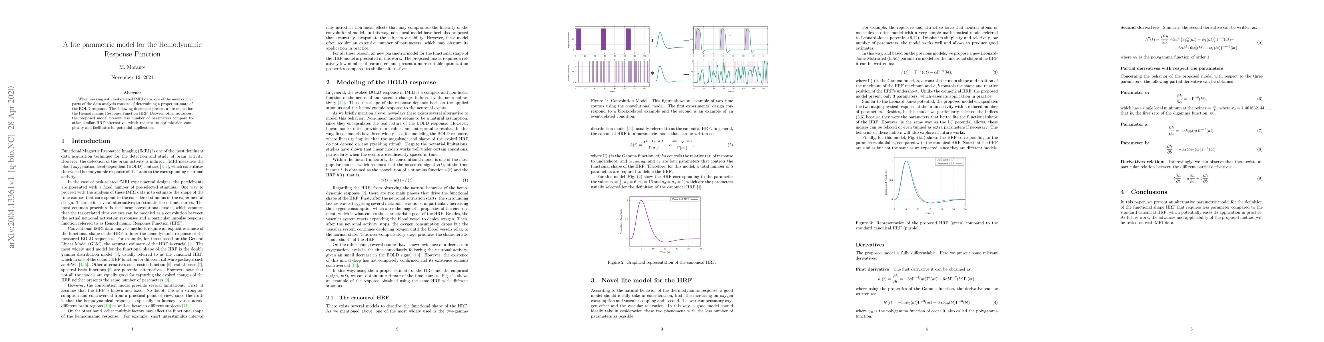 When working with task-related fMRI data, one of the most crucial parts of the data analysis consists of determining a proper estimate of the BOLD response. The following document presents a lite model for the Hemodynamic Response Function HRF. Between other advances, the proposed model present less number of parameters compared to other similar HRF alternative, which reduces its optimization complexity and facilitates its potential applications.