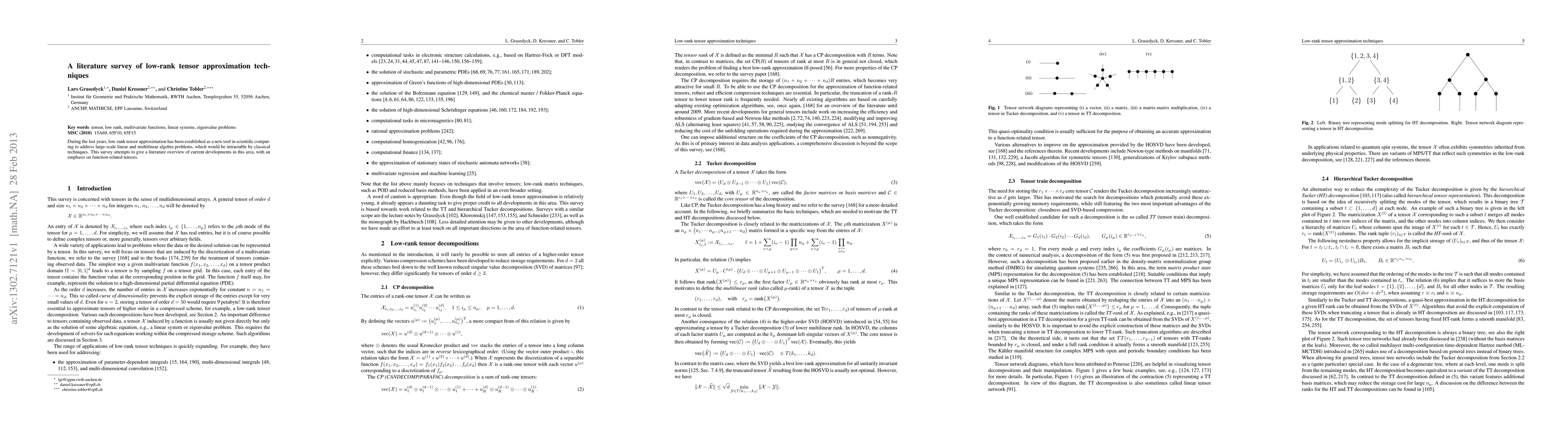 During the last years, low-rank tensor approximation has been established as a new tool in scientific computing to address large-scale linear and multilinear algebra problems, which would be intractable by classical techniques. This survey attempts to give a literature overview of current developments in this area, with an emphasis on function-related tensors.