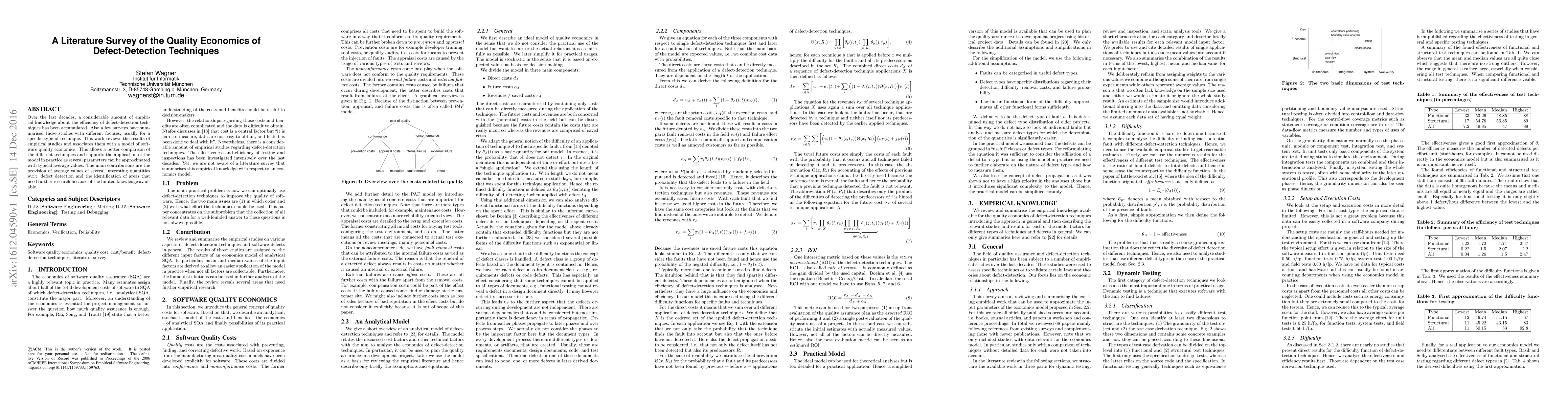 Over the last decades, a considerable amount of empirical knowledge about the efficiency of defect-detection techniques has been accumulated. Also a few surveys have summarised those studies with different focuses, usually for a specific type of technique. This work reviews the results of empirical studies and associates them with a model of software quality economics. This allows a better comparison of the different techniques and supports the application of the model in practice as several parameters can be approximated with typical average values. The main contributions are the provision of average values of several interesting quantities w.r.t. defect detection and the identification of areas that need further research because of the limited knowledge available.