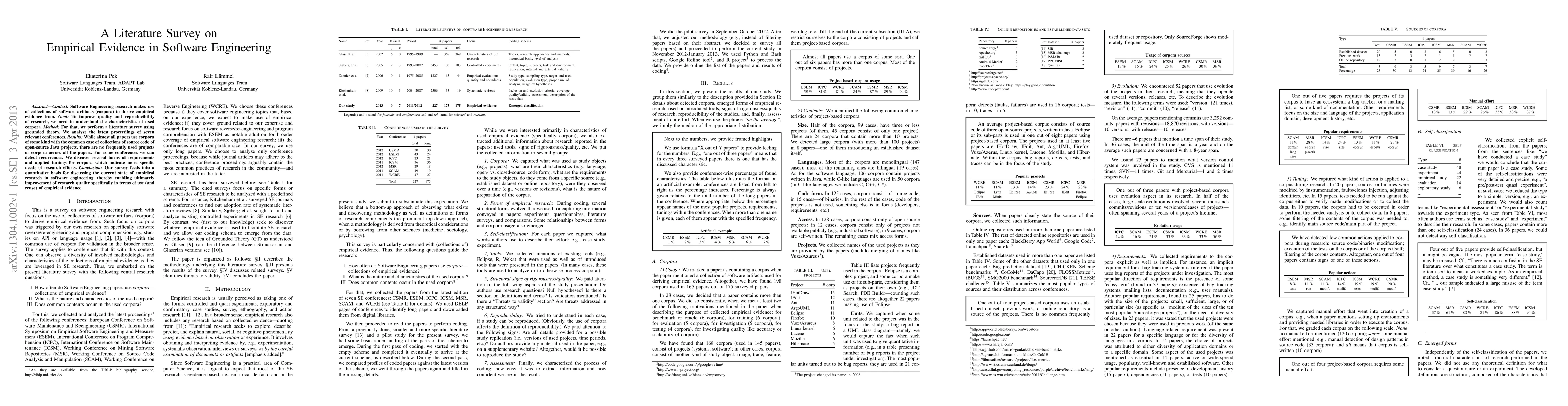 Context: Software Engineering research makes use of collections of software artifacts (corpora) to derive empirical evidence from. Goal: To improve quality and reproducibility of research, we need to understand the characteristics of used corpora. Method: For that, we perform a literature survey using grounded theory. We analyze the latest proceedings of seven relevant conferences. Results: While almost all papers use corpora of some kind with the common case of collections of source code of open-source Java projects, there are no frequently used projects or corpora across all the papers. For some conferences we can detect recurrences. We discover several forms of requirements and applied tunings for corpora which indicate more specific needs of research efforts. Conclusion: Our survey feeds into a quantitative basis for discussing the current state of empirical research in software engineering, thereby enabling ultimately improvement of research quality specifically in terms of use (and reuse) of empirical evidence.