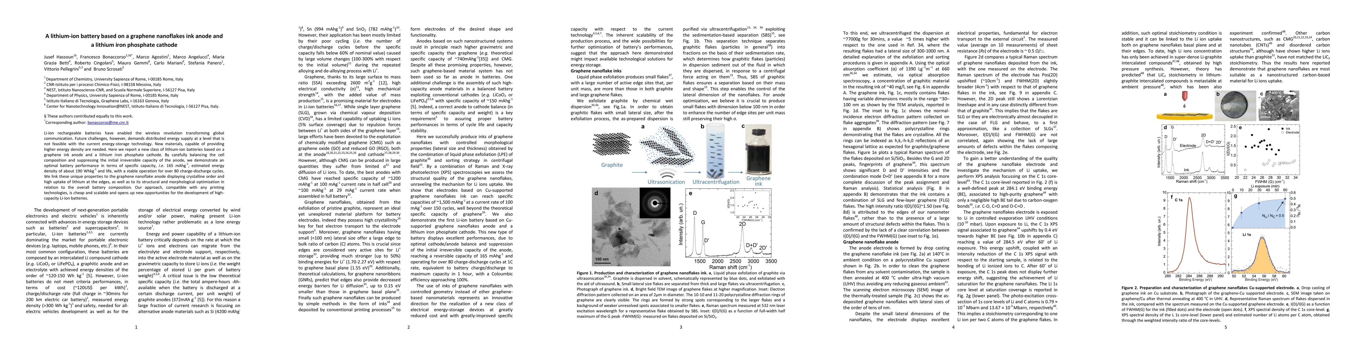 This paper presents a novel lithium-ion battery utilizing a graphene nanoflakes ink anode and a lithium iron phosphate cathode, achieving high specific capacity and energy density, and demonstrating stable performance over 80 cycles. The success is attributed to the structural optimization of the graphene anode and its compatibility with scalable printing technologies.