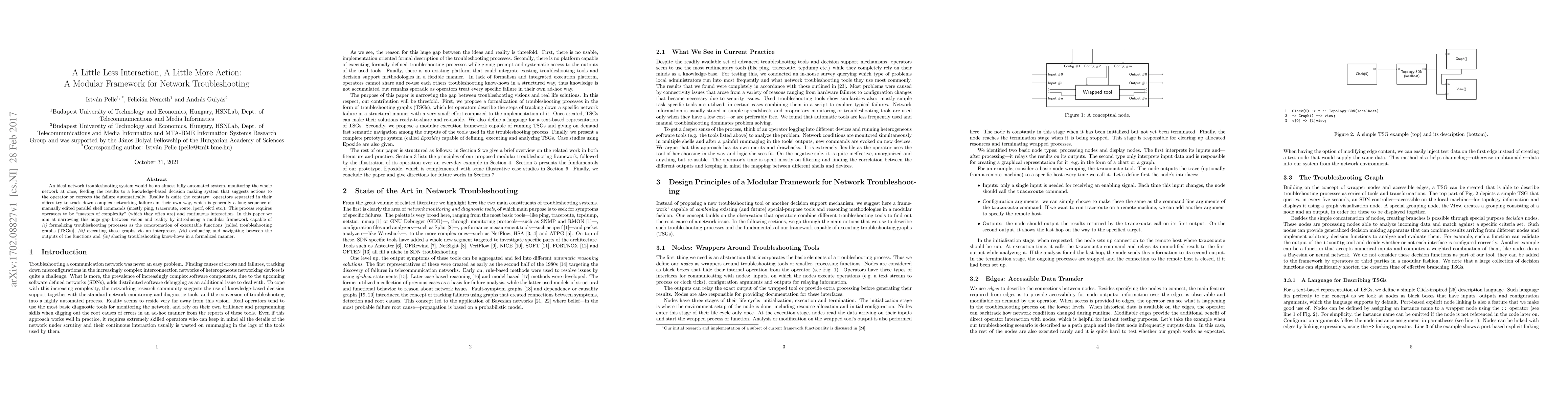A modular framework for network troubleshooting is introduced to automate complex problem-solving processes, formalizing troubleshooting steps and sharing knowledge between operators. The framework aims to narrow the gap between idealized automation and current manual troubleshooting methods used by operators.