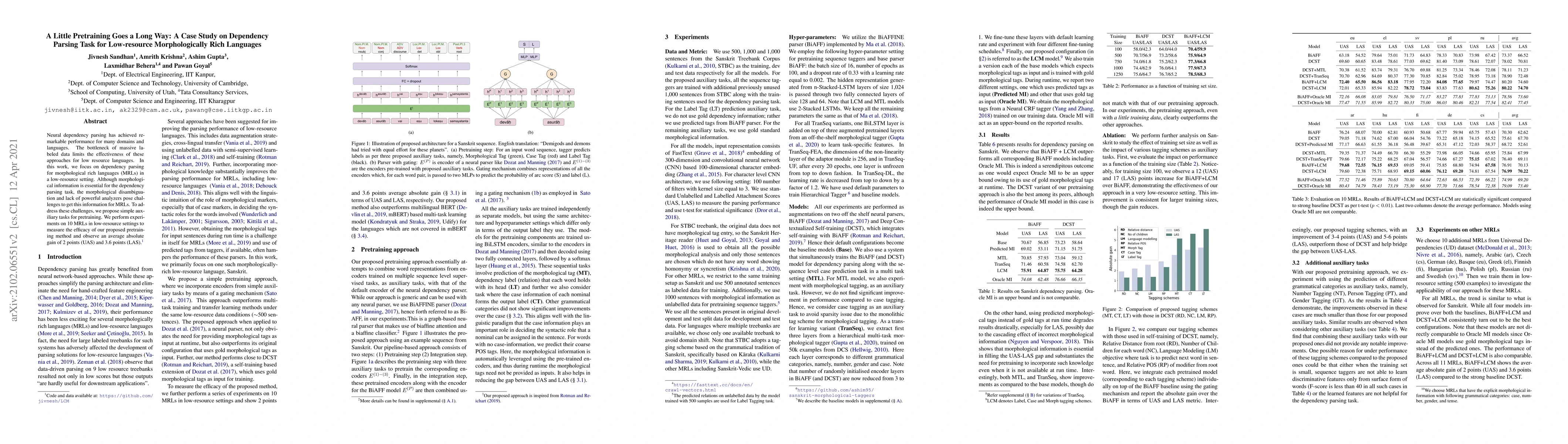 Neural dependency parsing has achieved remarkable performance for many domains and languages. The bottleneck of massive labeled data limits the effectiveness of these approaches for low resource languages. In this work, we focus on dependency parsing for morphological rich languages (MRLs) in a low-resource setting. Although morphological information is essential for the dependency parsing task, the morphological disambiguation and lack of powerful analyzers pose challenges to get this information for MRLs. To address these challenges, we propose simple auxiliary tasks for pretraining. We perform experiments on 10 MRLs in low-resource settings to measure the efficacy of our proposed pretraining method and observe an average absolute gain of 2 points (UAS) and 3.6 points (LAS). Code and data available at: https://github.com/jivnesh/LCM
