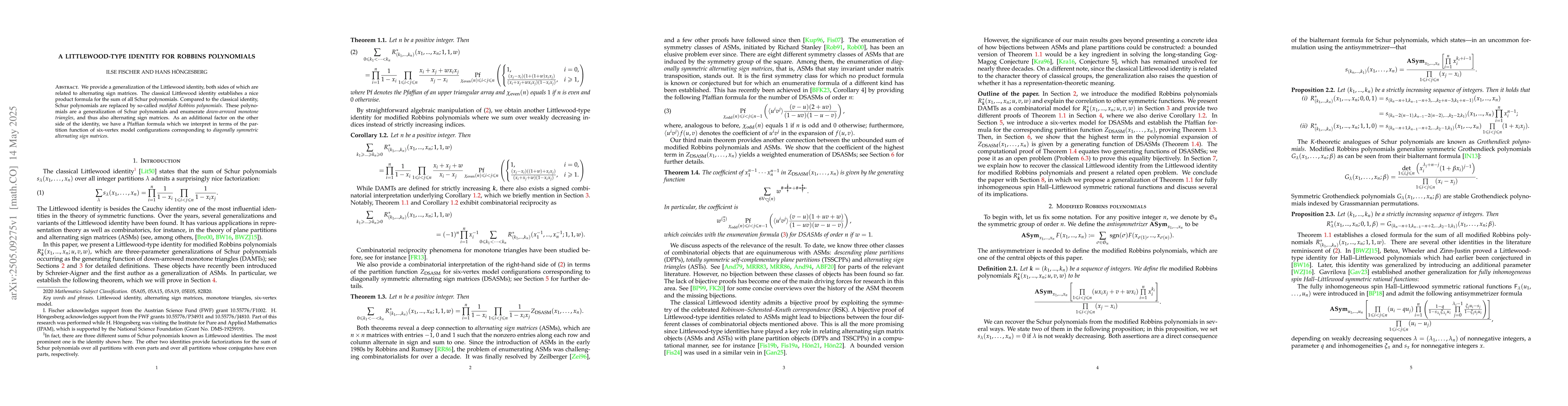 The paper provides a generalization of the Littlewood identity, replacing Schur polynomials with modified Robbins polynomials, which enumerate down-arrowed monotone triangles and alternating sign matrices.