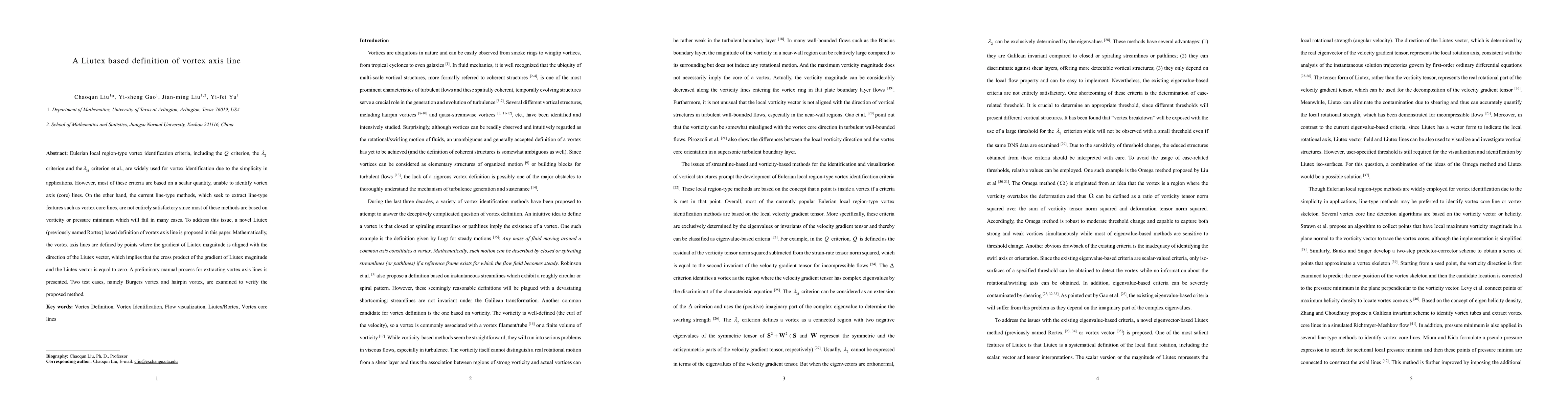 This paper proposes a novel Liutex-based definition for identifying vortex axis lines, addressing limitations of existing methods that fail to accurately locate vortex cores. The method defines vortex axis lines as points where the gradient of Liutex magnitude aligns with the Liutex vector direction, validated through tests on Burgers and hairpin vortices.