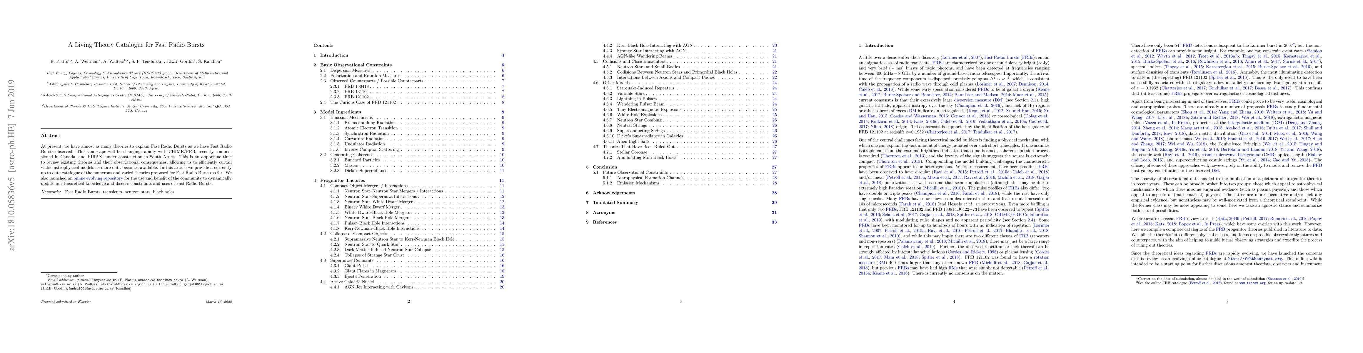 At present, we have almost as many theories to explain Fast Radio Bursts as we have Fast Radio Bursts observed. This landscape will be changing rapidly with CHIME/FRB, recently commissioned in Canada, and HIRAX, under construction in South Africa. This is an opportune time to review existing theories and their observational consequences, allowing us to efficiently curtail viable astrophysical models as more data becomes available. In this article we provide a currently up to date catalogue of the numerous and varied theories proposed for Fast Radio Bursts so far. We also launch an online evolving repository for the use and benefit of the community to dynamically update our theoretical knowledge and discuss constraints and uses of Fast Radio Bursts.