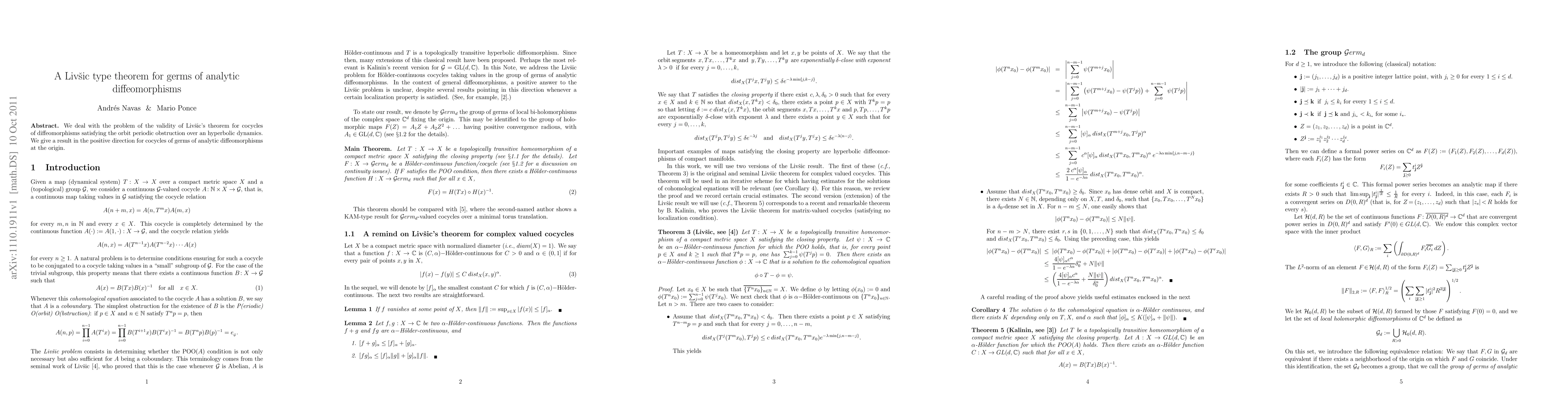 This research paper proves Livsic's theorem for germs of analytic diffeomorphisms at the origin, providing a positive result for cocycles with hyperbolic dynamics.