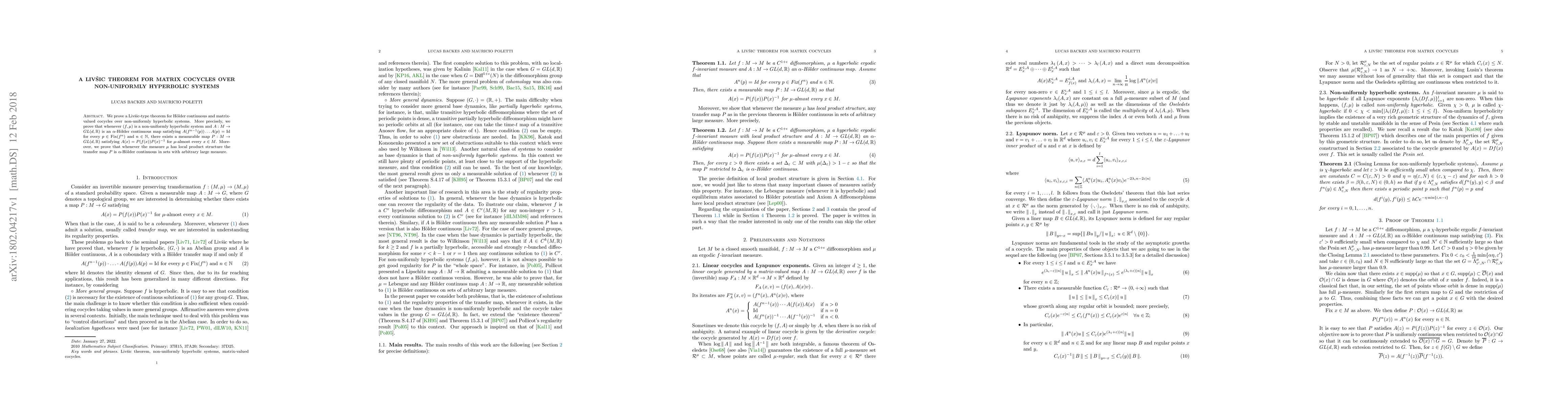 This paper proves a Livsić-type theorem for matrix cocycles over non-uniformly hyperbolic systems, showing the existence of a measurable map that conjugates the cocycle to a coboundary almost everywhere. It also demonstrates that the conjugacy is Hölder continuous when the measure has a local product structure.