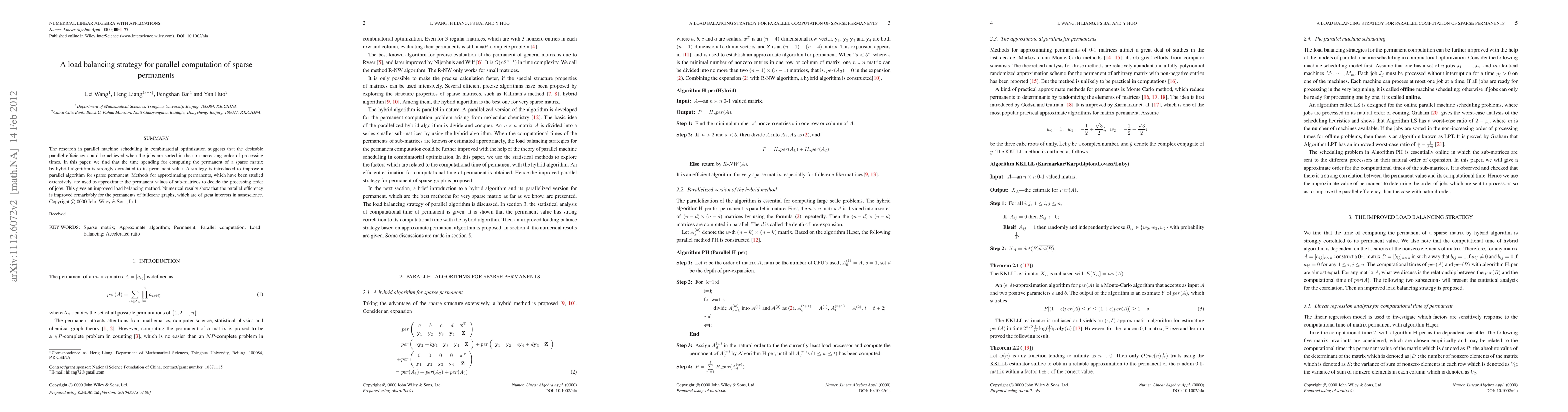 The research in parallel machine scheduling in combinatorial optimization suggests that the desirable parallel efficiency could be achieved when the jobs are sorted in the non-increasing order of processing times. In this paper, we find that the time spending for computing the permanent of a sparse matrix by hybrid algorithm is strongly correlated to its permanent value. A strategy is introduced to improve a parallel algorithm for sparse permanent. Methods for approximating permanents, which have been studied extensively, are used to approximate the permanent values of sub-matrices to decide the processing order of jobs. This gives an improved load balancing method. Numerical results show that the parallel efficiency is improved remarkably for the permanents of fullerene graphs, which are of great interests in nanoscience.