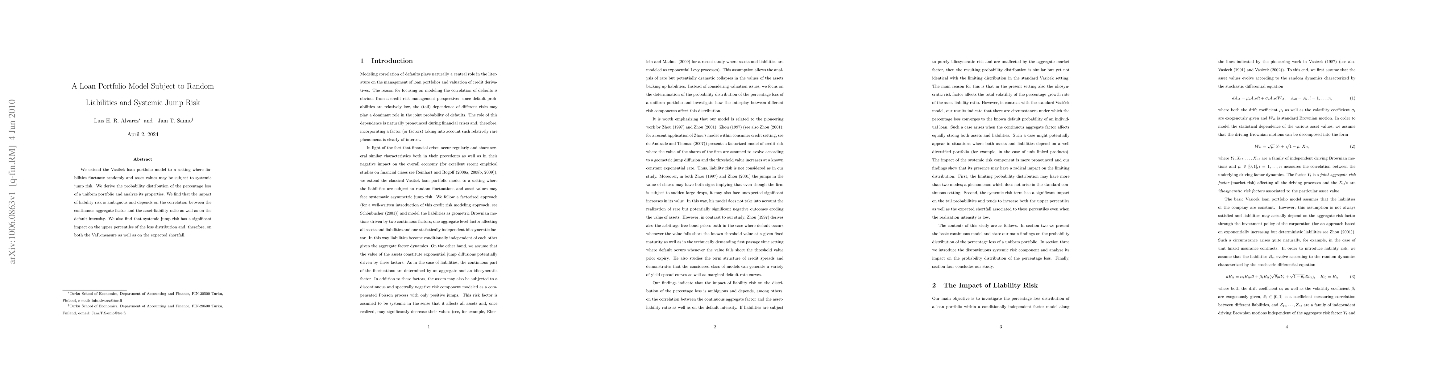 This paper extends the Vasiček loan portfolio model to incorporate random liabilities and systemic jump risk, deriving the probability distribution of portfolio losses. It finds that liability risk's impact is ambiguous, while systemic jump risk significantly affects the upper loss distribution, impacting both VaR and expected shortfall measures.