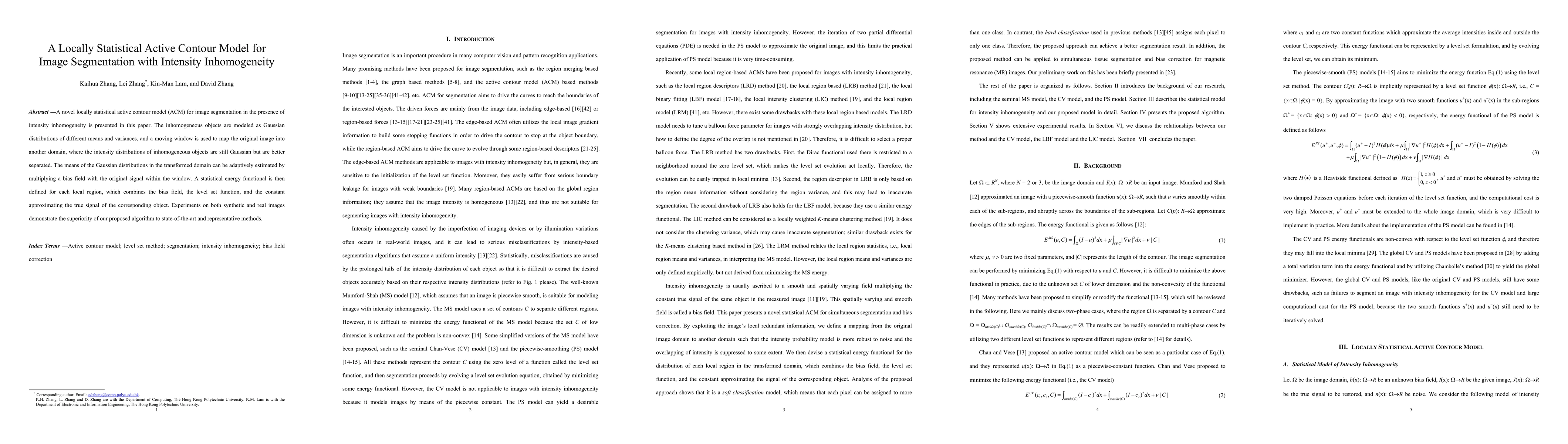 This paper introduces a locally statistical active contour model for image segmentation under intensity inhomogeneity, transforming the image to better separate Gaussian distributions, and adaptively estimating means using a bias field. Experiments show its superior performance over existing methods.