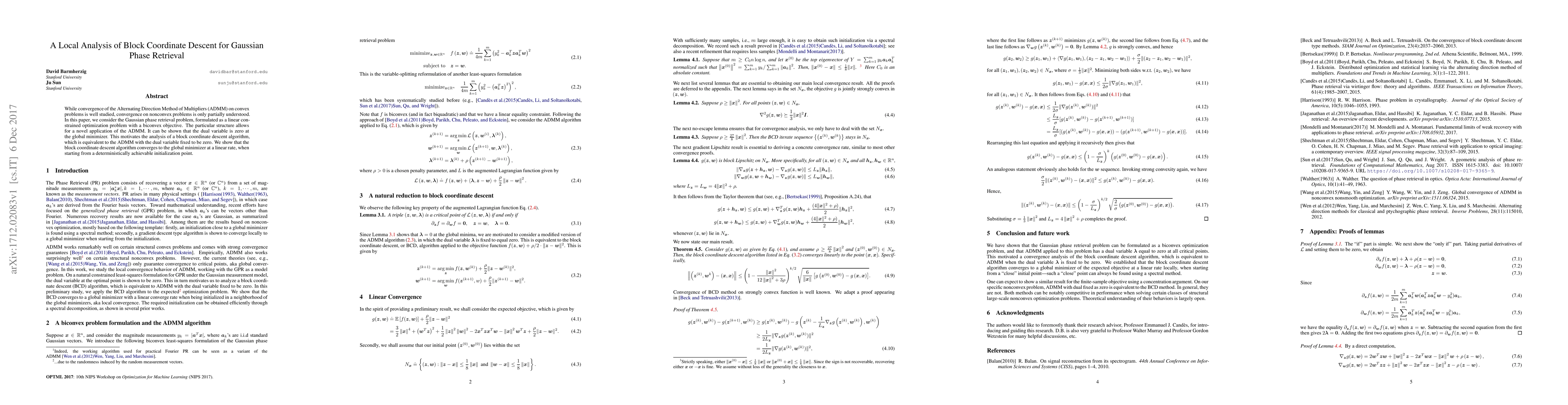 This paper investigates the convergence of a block coordinate descent algorithm for solving the Gaussian phase retrieval problem, demonstrating its equivalence to the ADMM with a fixed dual variable. It proves that the algorithm converges linearly to the global minimizer under a specific initialization condition.