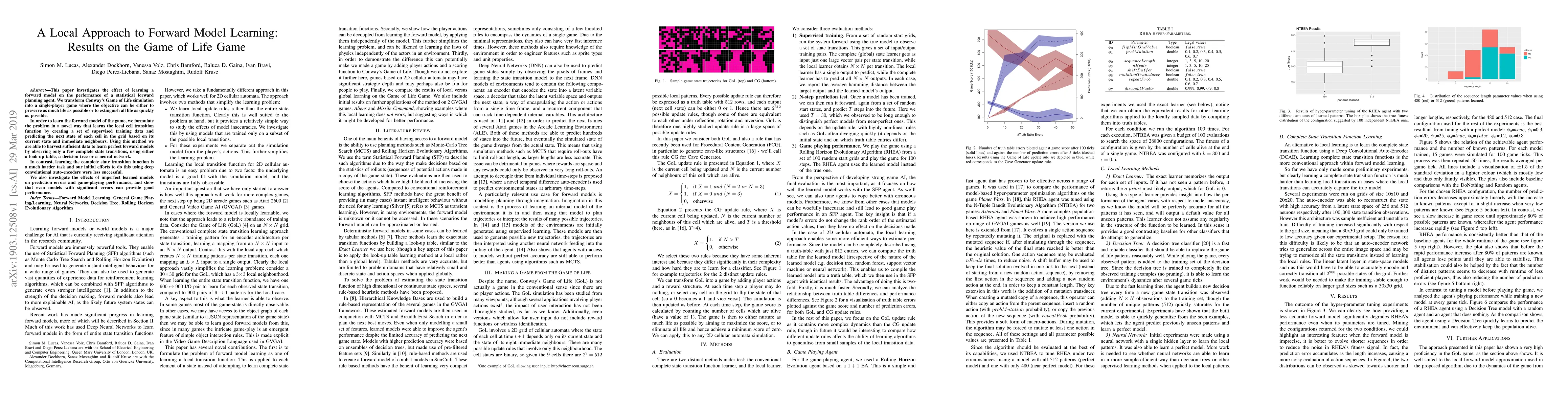 This paper explores learning a local forward model for Conway's Game of Life to enhance a statistical planning agent, achieving perfect predictions with minimal data using local cell transition functions. Despite challenges in learning the complete state transition function, imperfect models still yield good game-playing performance.