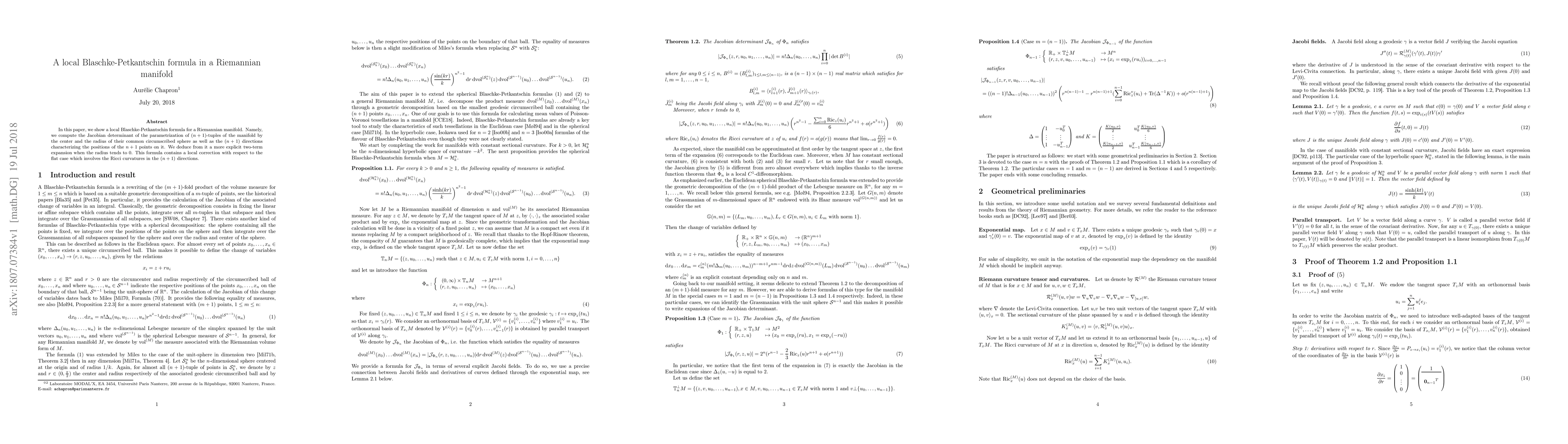 In this paper, we show a local Blaschke-Petkantschin formula for a Riemannian manifold. Namely, we compute the Jacobian determinant of the parametrization of $(n+1)$-tuples of the manifold by the center and the radius of their common circumscribed sphere as well as the $(n+1)$ directions characterizing the positions of the $n+1$ points on it. We deduce from it a more explicit two-term expansion when the radius tends to $0$. This formula contains a local correction with respect to the flat case which involves the Ricci curvatures in the $(n+1)$ directions.
