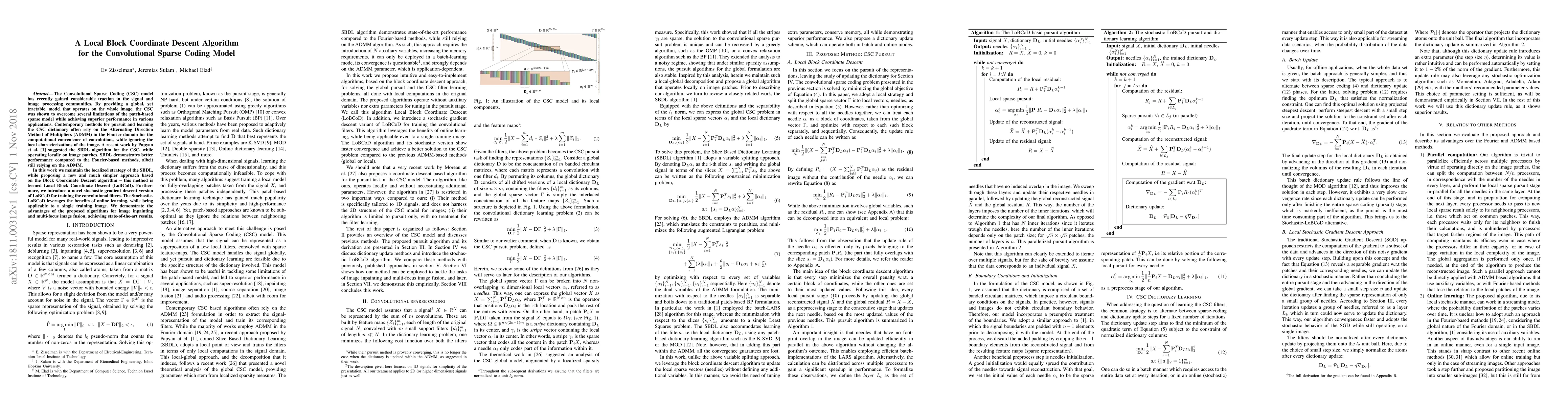 This paper proposes a Local Block Coordinate Descent (LoBCoD) algorithm for the Convolutional Sparse Coding (CSC) model, which operates locally on image patches for better performance compared to Fourier-based methods. It also introduces a stochastic gradient descent version for online learning, achieving state-of-the-art results in image inpainting and multi-focus image fusion.
