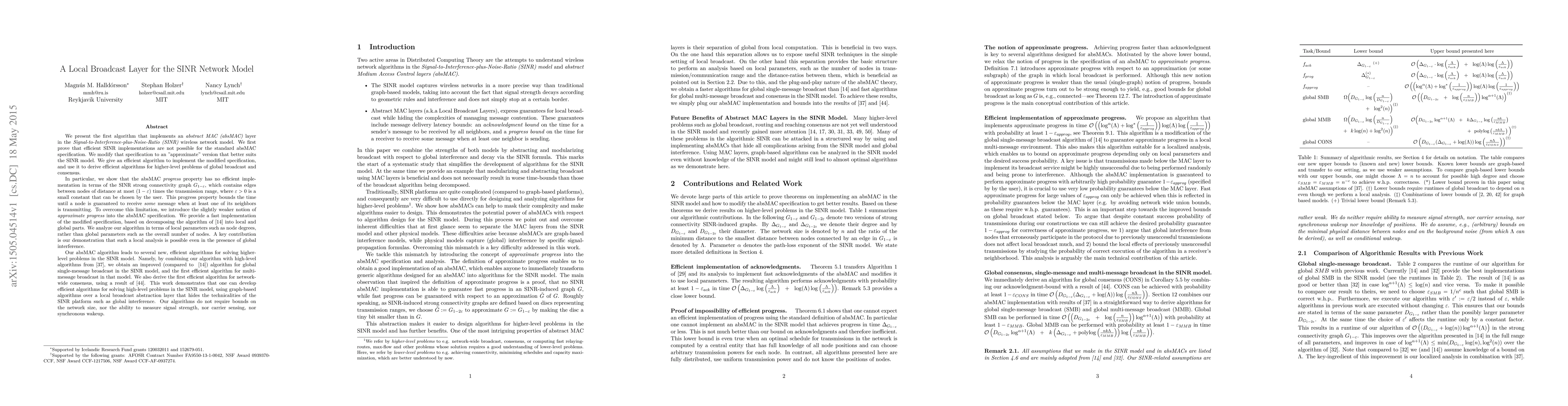 The paper presents an algorithm for an abstract MAC (absMAC) layer implemented in the SINR wireless network model, modifying the standard absMAC specification to an approximate version that better suits the SINR model. It introduces efficient algorithms for global broadcast and consensus based on this modified specification.