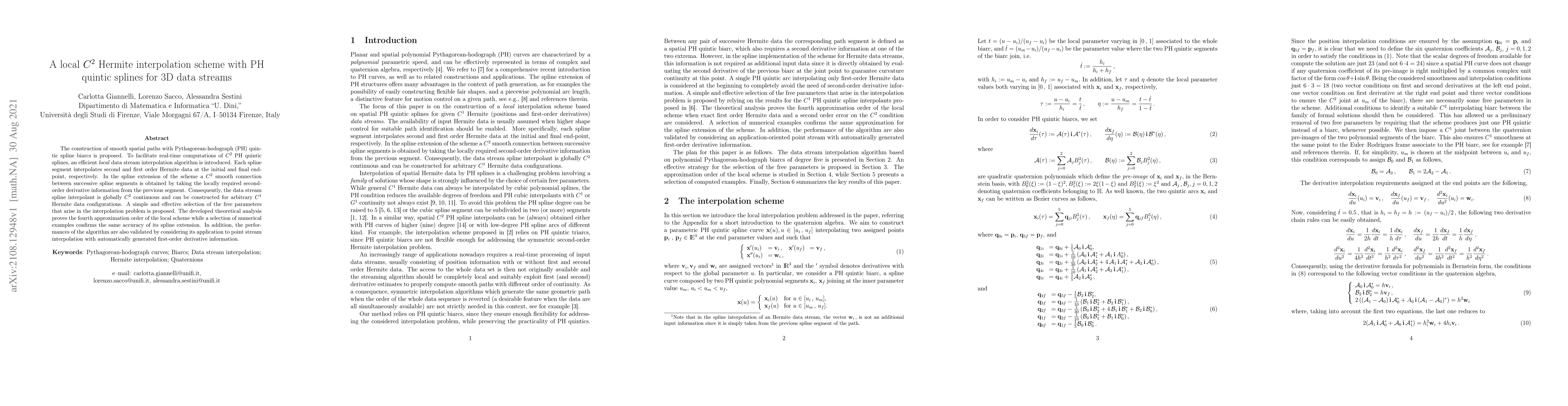 This paper proposes a local $C^2$ Hermite interpolation scheme using PH quintic spline biarcs for smooth 3D spatial paths. The method ensures $C^2$ continuity and fourth-order accuracy through efficient local interpolation and parameter selection.