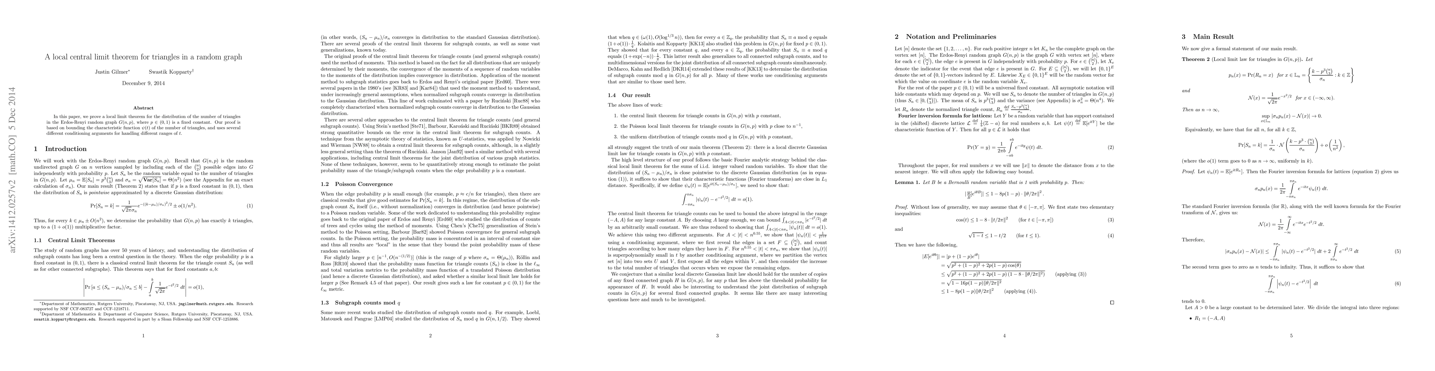 Summary: This paper establishes a local central limit theorem for the number of triangles in the Erdos-Renyi random graph $G(n,p)$, proving the distribution's behavior through characteristic function bounds and various conditioning techniques.