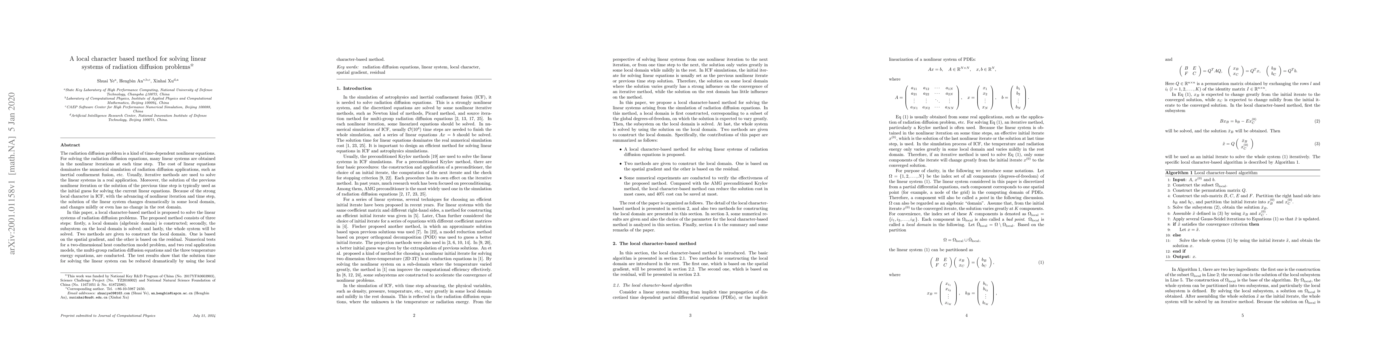 The radiation diffusion problem is a kind of {time-dependent} nonlinear equations. For solving the radiation diffusion equations, many linear systems are obtained in the nonlinear iterations at each time step. The cost of linear equations dominates the numerical simulation of radiation diffusion applications, such as inertial confinement fusion, etc. {Usually,} iterative methods are used to solve the linear systems in {a} real application. {Moreover, the solution of the previous nonlinear iteration or the solution of the previous time step is typically used as the initial guess for solving the current linear equations.} Because of the strong local character in ICF, with the advancing of nonlinear iteration and time step, the solution of the linear system changes dramatically in some local domain, and changes mildly or even has no change in the rest domain. In this paper, a local {character-based} method is proposed to solve the linear systems of radiation diffusion problems. The proposed method consists of three steps: firstly, a local domain (algebraic domain) is constructed; secondly, the subsystem on the local domain is solved; and lastly, the whole system will be solved. Two methods are given to construct the local domain. One is based on the spatial gradient, and the other is based on the residual. Numerical tests for a two-dimensional heat conduction model problem, and two real application models, the multi-group radiation diffusion equations and the three temperature energy equations, are conducted. The test results show that the solution time for solving the linear system can be reduced dramatically by using the local character-based method.