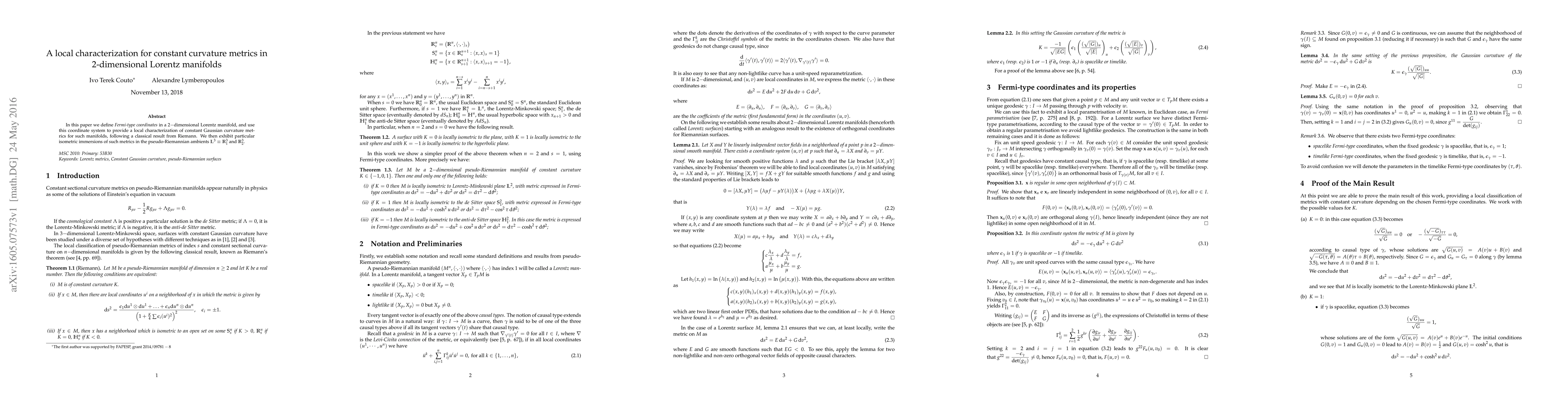 This paper defines Fermi-type coordinates in 2-dimensional Lorentz manifolds and uses them to characterize constant Gaussian curvature metrics locally, extending a classical Riemannian result. It also presents specific isometric immersions of these metrics in pseudo-Riemannian ambients L^3 and R^3_2.