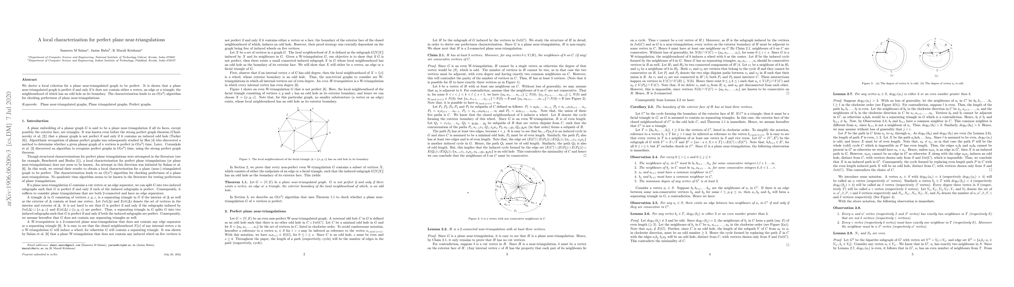 This paper provides a local criterion for determining the perfectness of plane near-triangulated graphs, showing that such graphs are perfect if they lack neighborhoods with odd holes as boundaries. The derived criterion enables an efficient $O(n^2)$ algorithm for verifying perfectness.