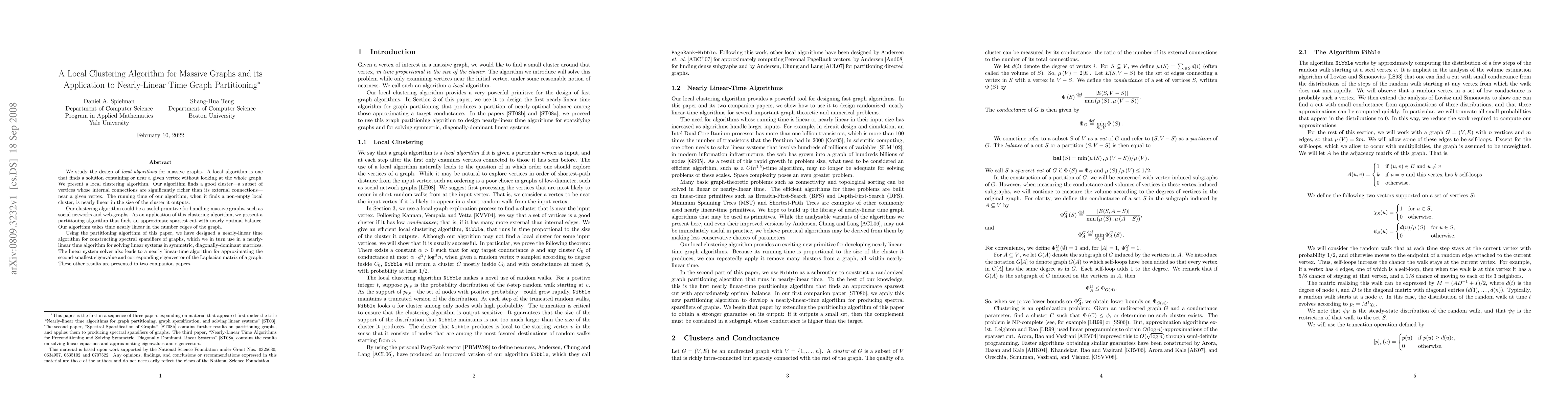 This paper introduces a local clustering algorithm for massive graphs that identifies dense clusters near a given vertex in nearly linear time. It applies this clustering method to develop a nearly-linear time graph partitioning algorithm for finding approximate sparsest cuts.