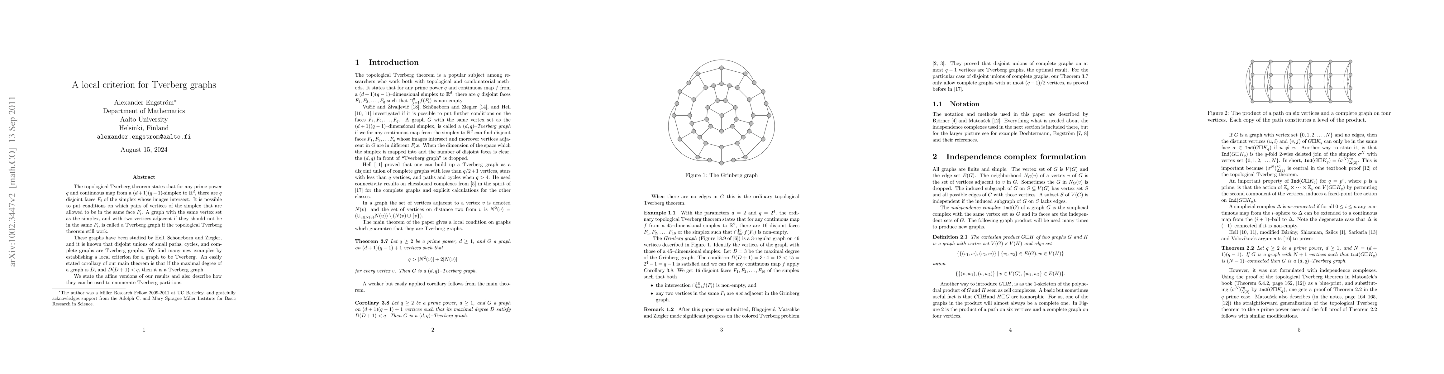 This paper establishes a local criterion for determining whether a graph is a Tverberg graph, extending known examples to include new cases. A corollary states that graphs with a maximal degree D satisfying D(D+1) < q are Tverberg graphs. The authors also discuss affine versions of these results and their application in enumerating Tverberg partitions.