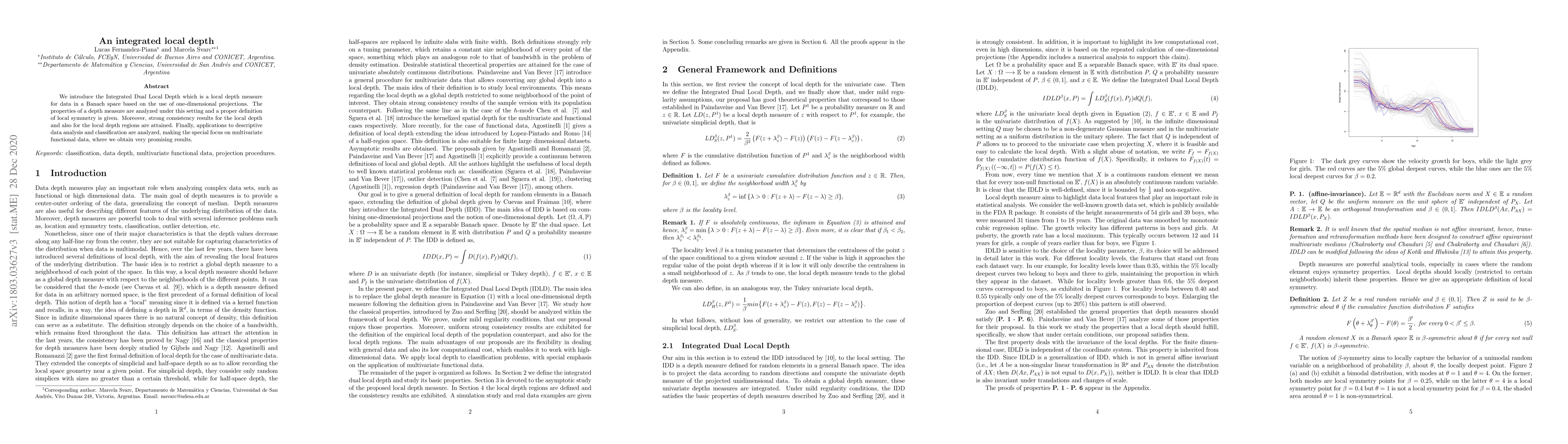 This paper introduces the Integrated Dual Local Depth, a novel local depth measure for data in Banach spaces using one-dimensional projections, and analyzes its properties and consistency. It also demonstrates applications in descriptive data analysis and classification, particularly for multivariate functional data.
