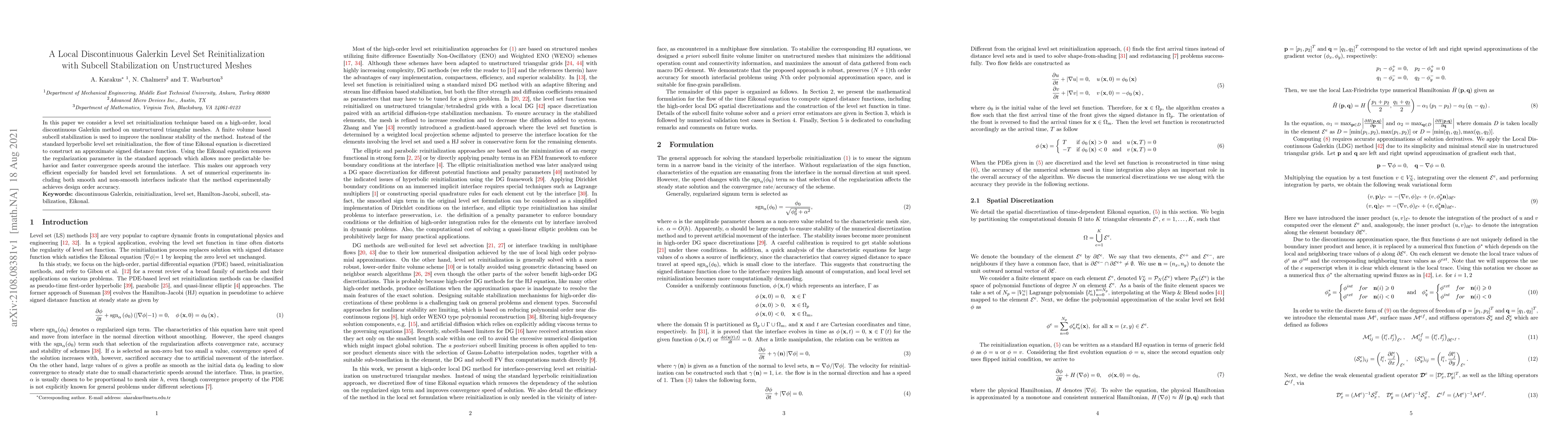 This paper proposes a high-order local discontinuous Galerkin method for level set reinitialization on unstructured meshes, enhanced by subcell stabilization for improved stability. The use of the Eikonal equation eliminates the regularization parameter, offering faster convergence and more predictable behavior around interfaces, validated through numerical experiments.