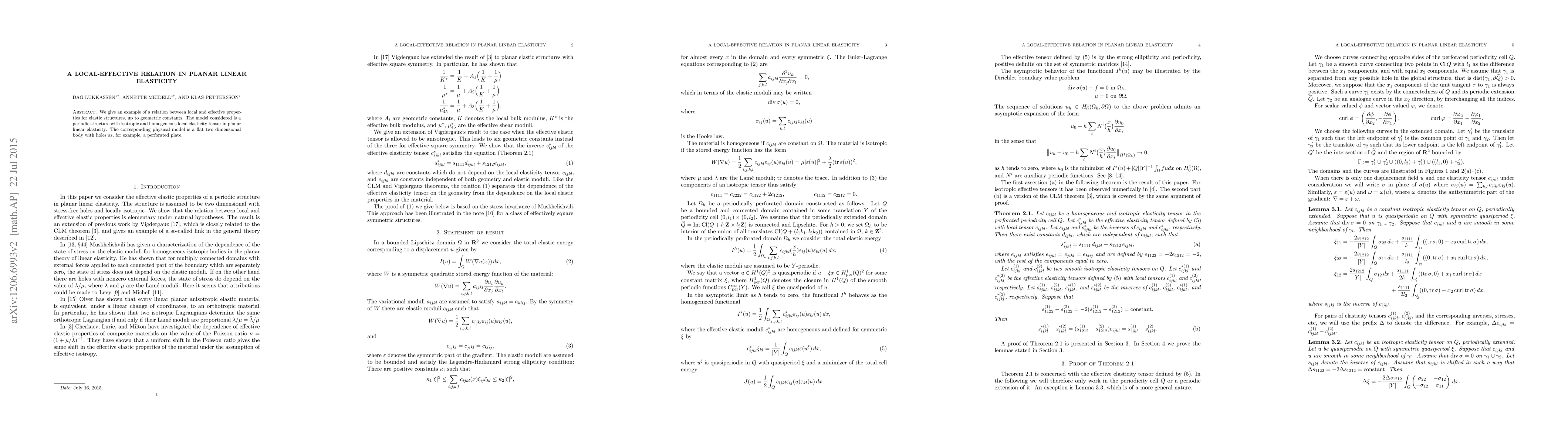 Summary: This paper presents a local-effective property relation for planar linear elasticity in periodic structures with isotropic and homogeneous local elasticity tensors, exemplified by a perforated plate with holes. The findings provide geometric constants linking local and effective material properties.