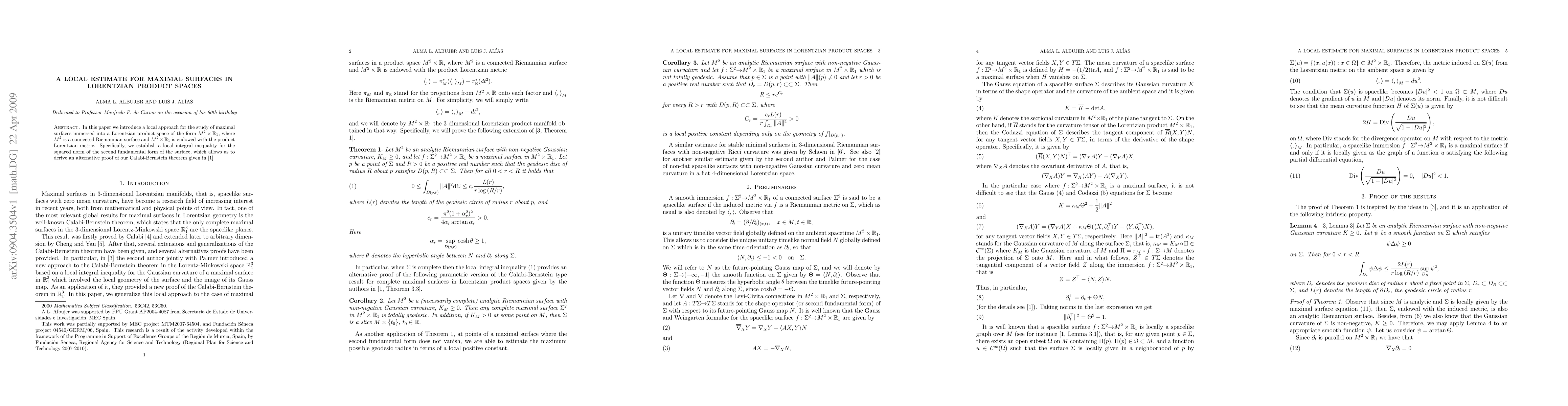In this paper we introduce a local approach for the study of maximal surfaces immersed into a Lorentzian product space of the form $M^2\times R_1$, where $M^2$ is a connected Riemannian surface and $M^2\times R_1$ is endowed with the product Lorentzian metric. Specifically, we establish a local integral inequality for the squared norm of the second fundamental form of the surface, which allows us to derive an alternative proof of our Calabi-Bernstein theorem given in \cite{AA}.