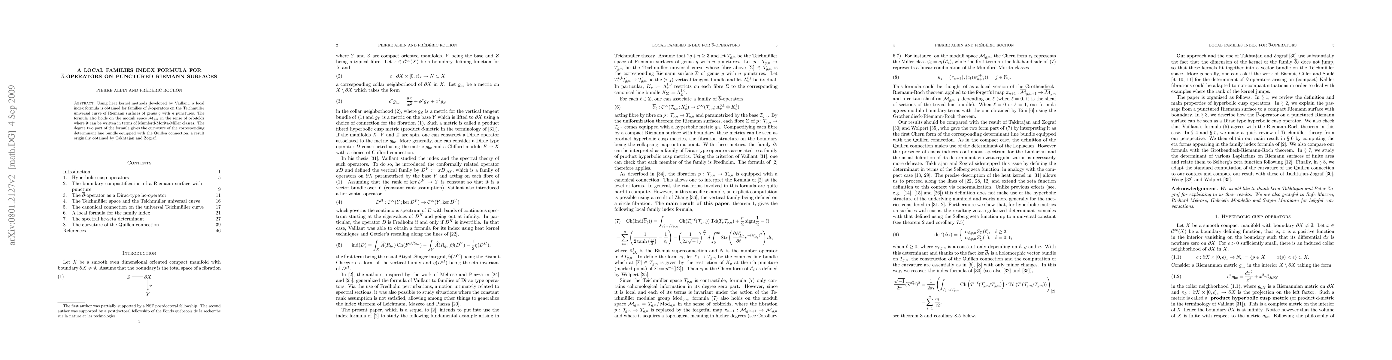 This paper derives a local index formula for families of d-bar operators on punctured Riemann surfaces using Vaillant's heat kernel methods. The formula is applicable on the Teichmuller universal curve and the moduli space M{g,n}, expressed in terms of Mumford-Morita-Miller classes, and recovers the curvature of the determinant line bundle as originally found by Takhtajan and Zograf.