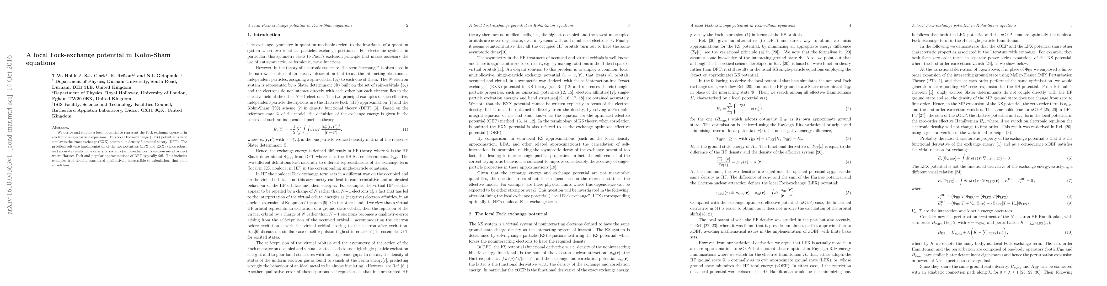 We derive and employ a local potential to represent the Fock exchange operator in electronic single-particle equations. This local Fock-exchange (LFX) potential is very similar to the exact exchange (EXX) potential in density functional theory (DFT). The practical software implementation of the two potentials (LFX and EXX) yields robust and accurate results for a variety of systems (semiconductors, transition metal oxides) where Hartree Fock and popular approximations of DFT typically fail. This includes examples traditionally considered qualitatively inaccessible to calculations that omit correlation.