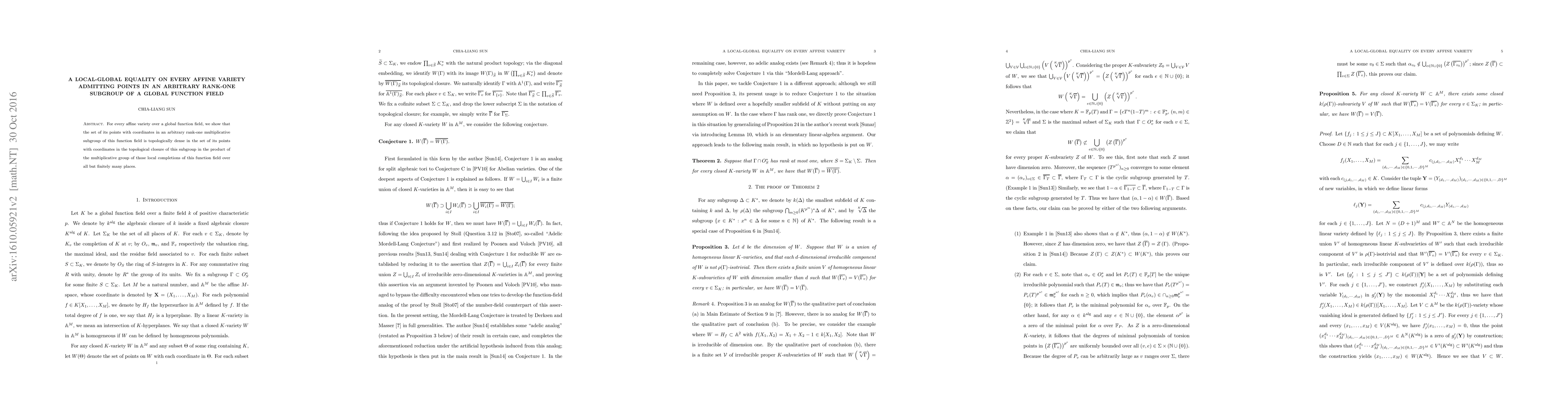 For every affine variety over a global function field, we show that the set of its points with coordinates in an arbitrary rank-one multiplicative subgroup of this function field is topologically dense in the set of its points with coordinates in the topological closure of this subgroup in the product of the multiplicative group of those local completions of this function field over all but finitely many places.