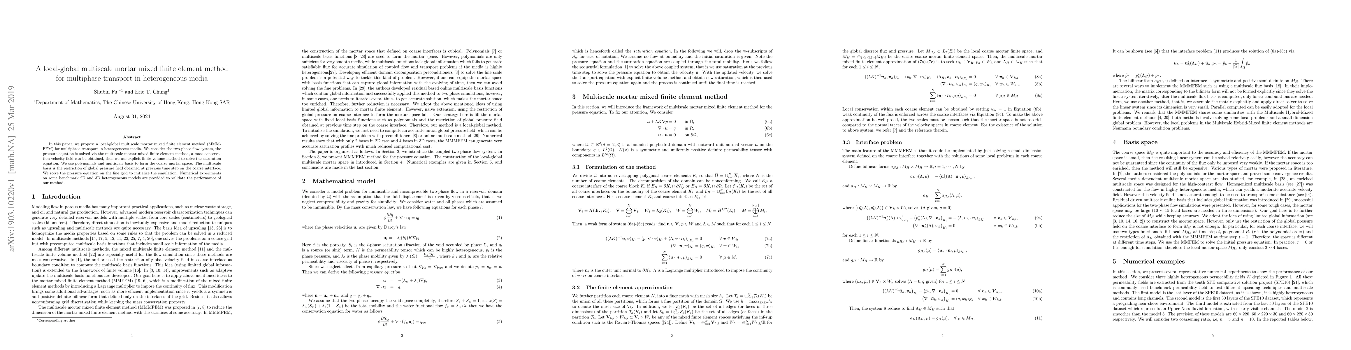 This paper introduces a local-global multiscale mortar mixed finite element method (MMMFEM) for simulating multiphase transport in heterogeneous media, combining a multiscale mortar approach with a finite volume method to solve the pressure and saturation equations respectively. Numerical experiments validate the method's effectiveness on benchmark models.