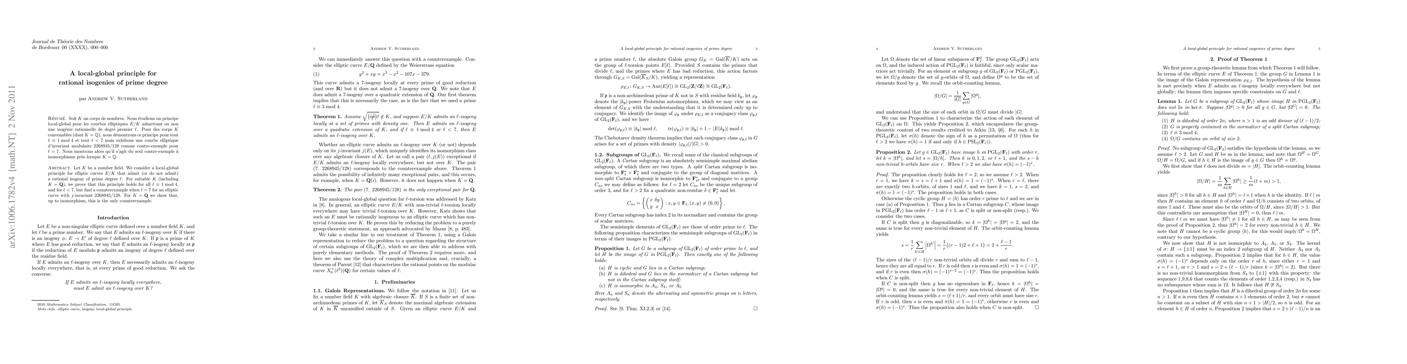 Researchers prove a local-global principle for rational isogenies of prime degree on elliptic curves, finding counterexamples for n = 7, but no others for K = Q.