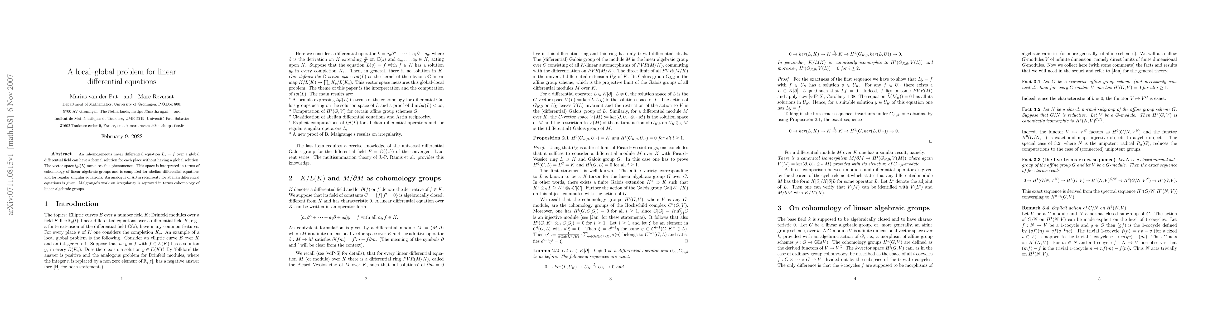 This paper investigates the local-global principle for inhomogeneous linear differential equations, introducing the vector space lgl(L) to quantify the absence of global solutions despite local ones. It connects this concept to the cohomology of linear algebraic groups and computes it for abelian and regular singular equations, establishing an Artin reciprocity analogue and reinterpreting Malgrange's irregularity results through this cohomological framework.