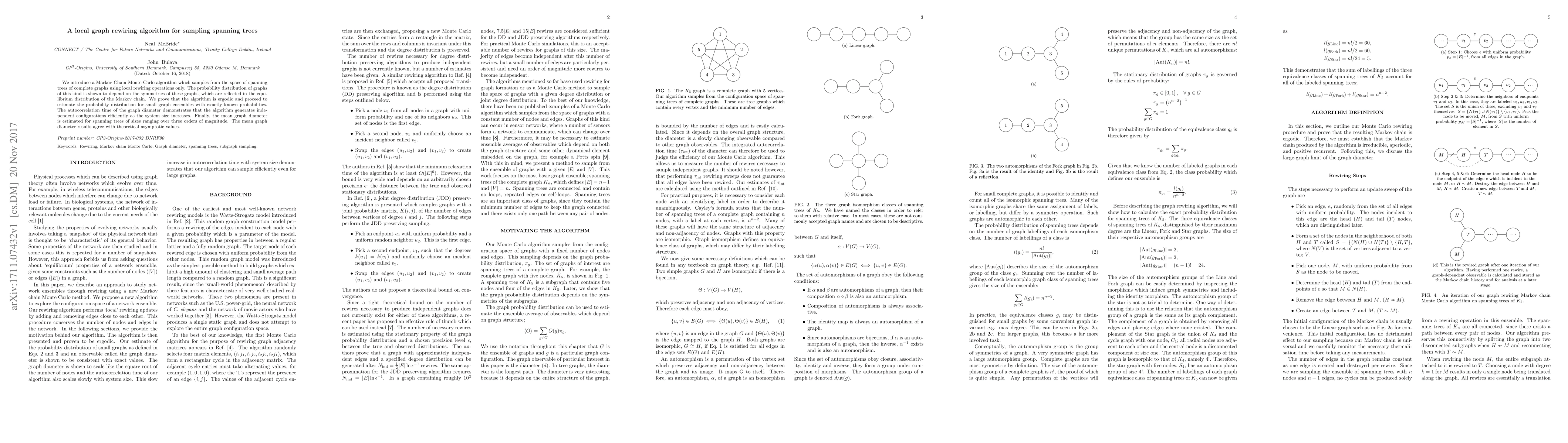 This paper presents a Markov Chain Monte Carlo algorithm for sampling spanning trees in complete graphs via local rewiring, proving its ergodicity and estimating the probability distribution for small graphs. The algorithm efficiently generates independent configurations, and results for mean graph diameter align with theoretical predictions.