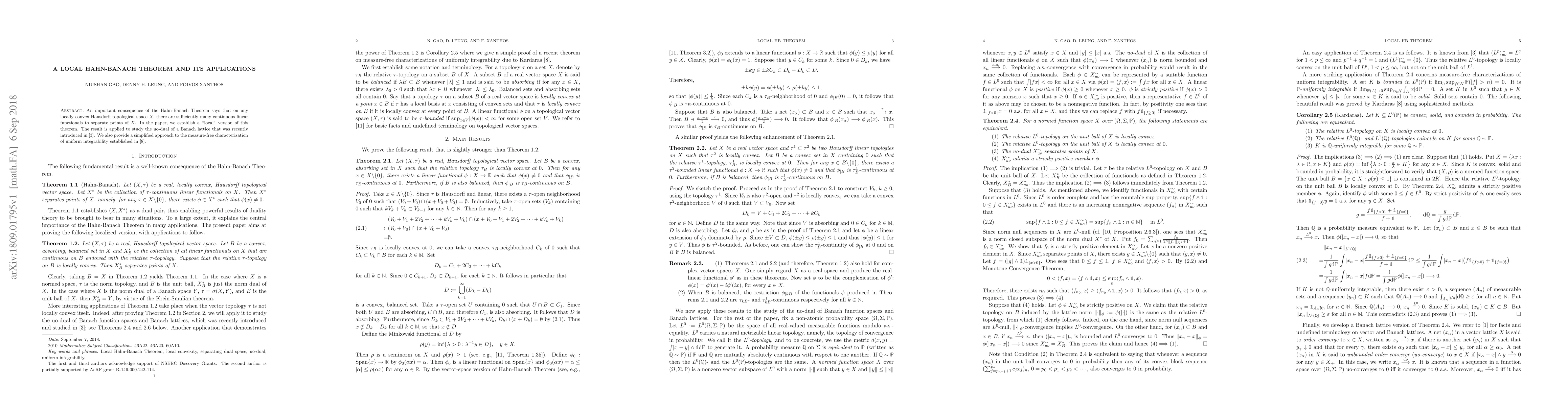 This paper establishes a local version of the Hahn-Banach Theorem, which ensures the existence of continuous linear functionals to separate points in locally convex Hausdorff spaces. It applies this result to analyze the uo-dual of Banach lattices and simplifies the measure-free characterization of uniform integrability.