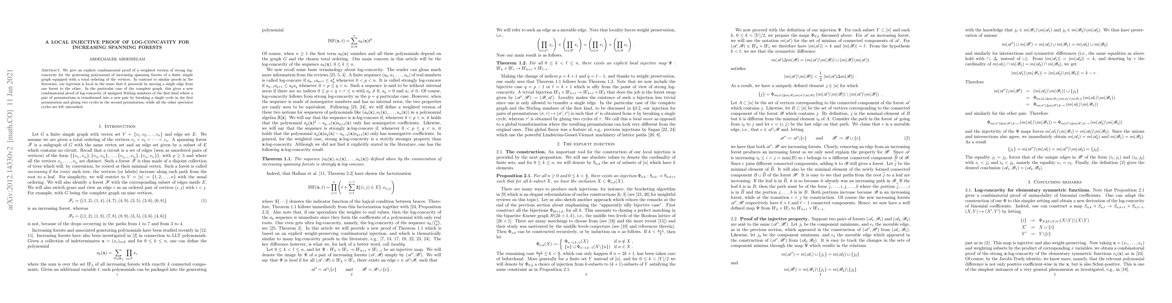 We give an explicit combinatorial proof of a weighted version of strong log-concavity for the generating polynomial of increasing spanning forests of a finite simple graph equipped with a total ordering of the vertices. In contrast to similar proofs in the literature, our injection is local in the sense that it proceeds by moving a single edge from one forest to the other. In the particular case of the complete graph, this gives a new combinatorial proof of log-concavity of unsigned Stirling numbers of the first kind where a pair of permutations is transformed into a new pair by breaking a single cycle in the first permutation and gluing two cycles in the second permutation, while all the other spectator cycles are left untouched.