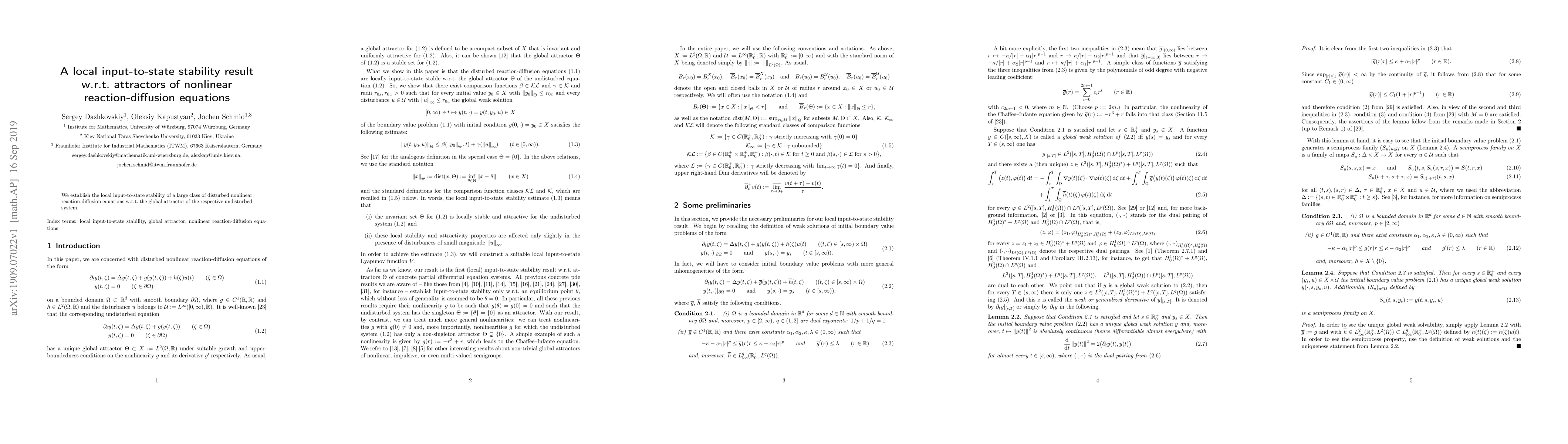 This paper establishes local input-to-state stability for a large class of nonlinear reaction-diffusion equations in relation to their global attractors, showing that small disturbances do not significantly alter the system's long-term behavior.