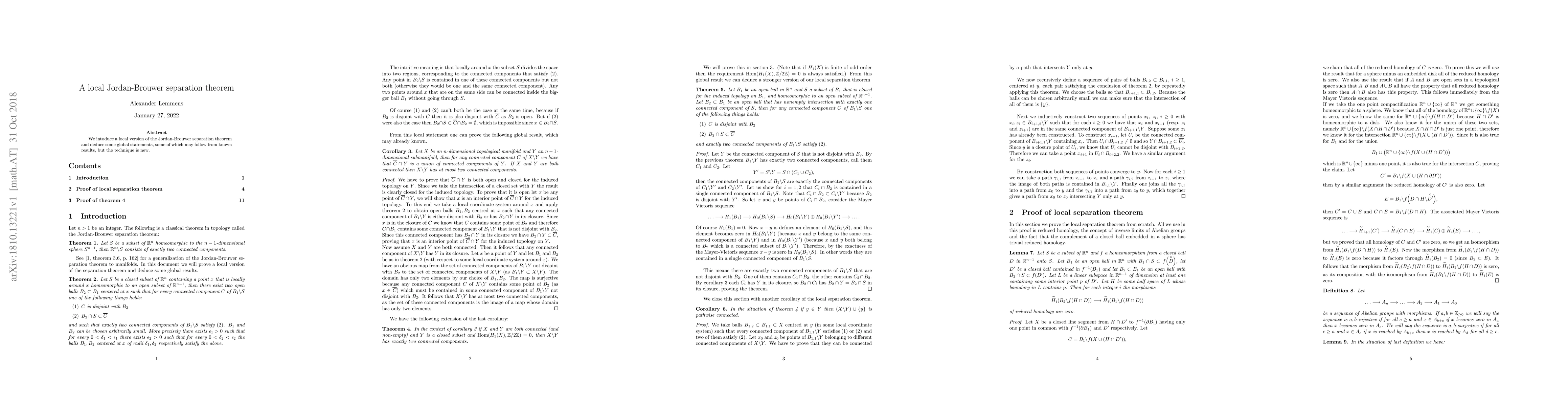 This paper presents a localized version of the Jordan-Brouwer separation theorem, introducing new techniques to derive global implications, some of which might be derivable through existing results but with a novel approach.