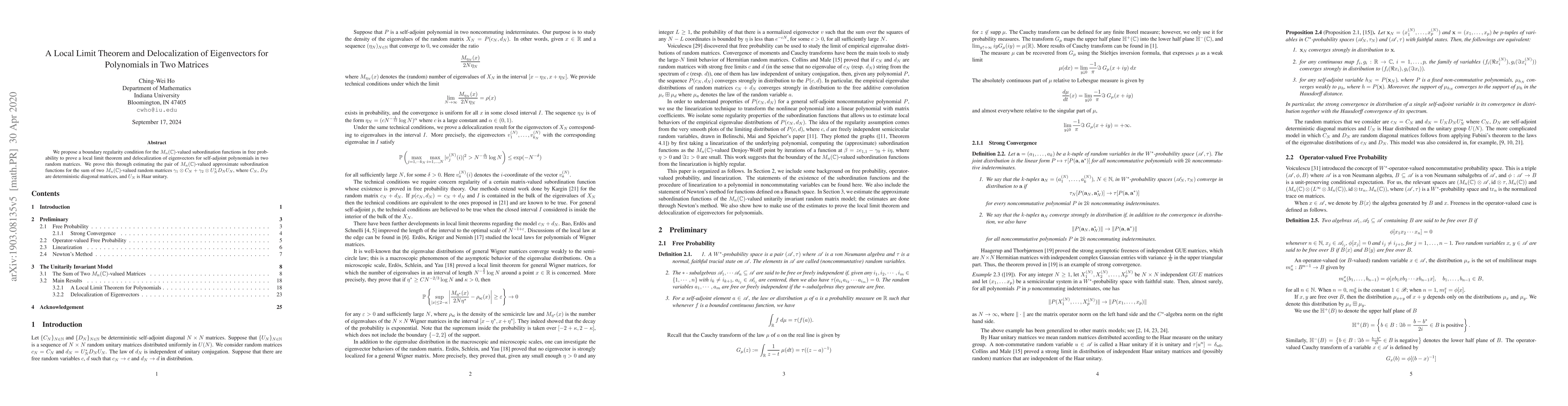 This paper establishes a local limit theorem and demonstrates eigenvector delocalization for polynomials in two random matrices by introducing a boundary regularity condition for subordination functions in free probability. The proof involves estimating the approximate subordination functions for the sum of two specific random matrix products.
