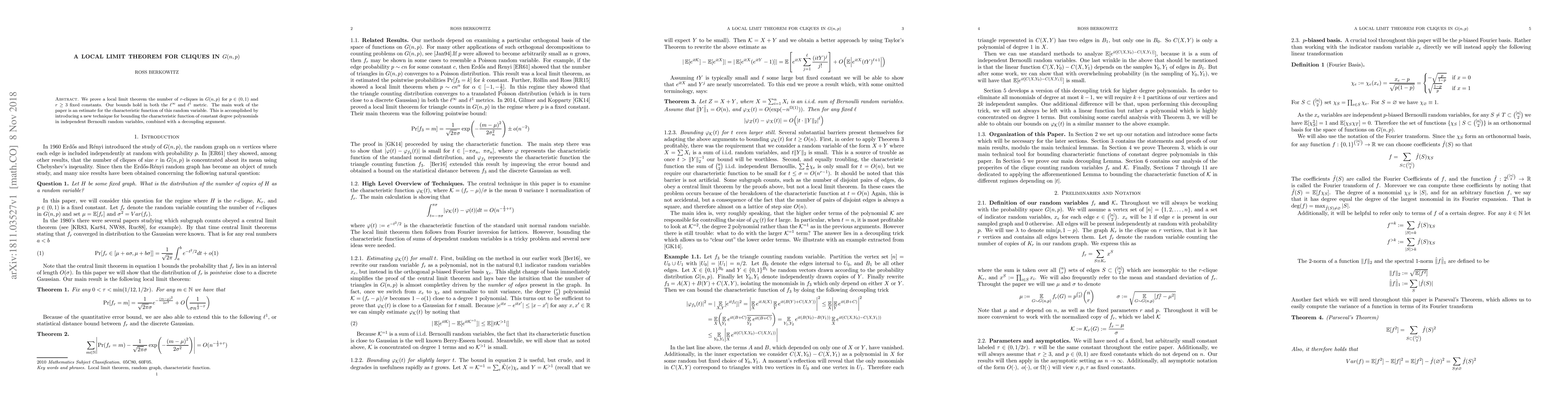 We prove a local limit theorem the number of $r$-cliques in $G(n,p)$ for $p\in(0,1)$ and $r\ge 3$ fixed constants. Our bounds hold in both the $\ell^\infty$ and $\ell^1$ metric. The main work of the paper is an estimate for the characteristic function of this random variable. This is accomplished by introducing a new technique for bounding the characteristic function of constant degree polynomials in independent Bernoulli random variables, combined with a decoupling argument.