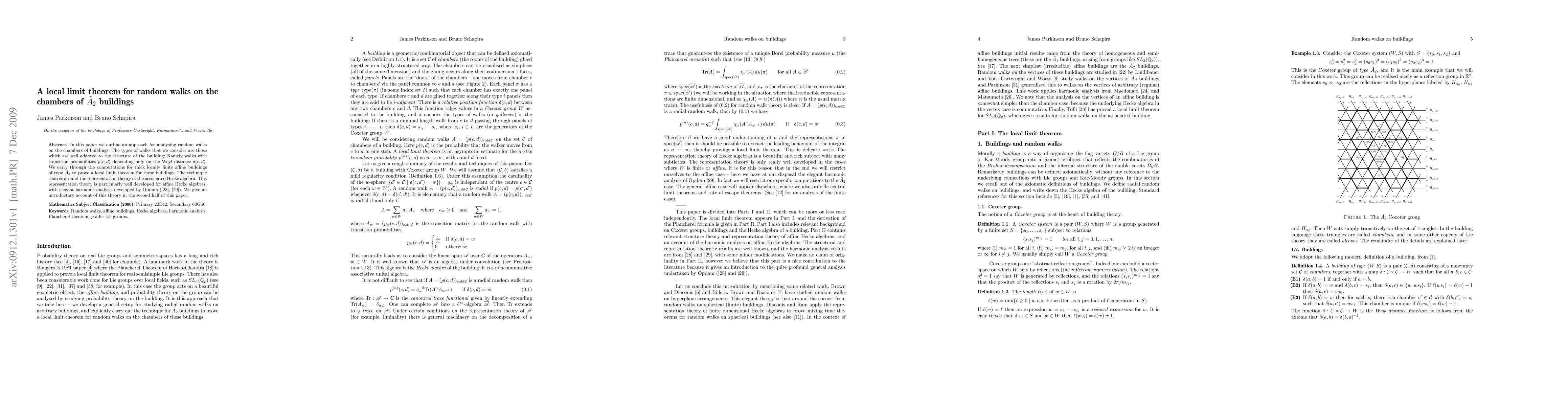 In this paper we outline an approach for analysing random walks on the chambers of buildings. The types of walks that we consider are those which are well adapted to the structure of the building: Namely walks with transition probabilities $p(c,d)$ depending only on the Weyl distance $\delta(c,d)$. We carry through the computations for thick locally finite affine buildings of type $\tilde{A}_2$ to prove a local limit theorem for these buildings. The technique centres around the representation theory of the associated Hecke algebra. This representation theory is particularly well developed for affine Hecke algebras, with elegant harmonic analysis developed by Opdam. We give an introductory account of this theory in the second half of this paper.