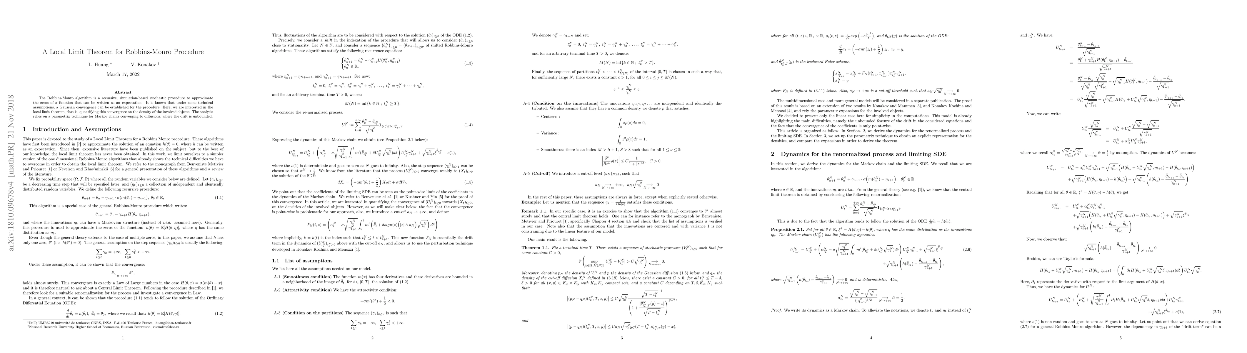 This paper establishes a local limit theorem for the Robbins-Monro procedure, showing that it converges to a Gaussian distribution under certain conditions. The analysis uses a parametrix technique to quantify this convergence on the density of involved objects.